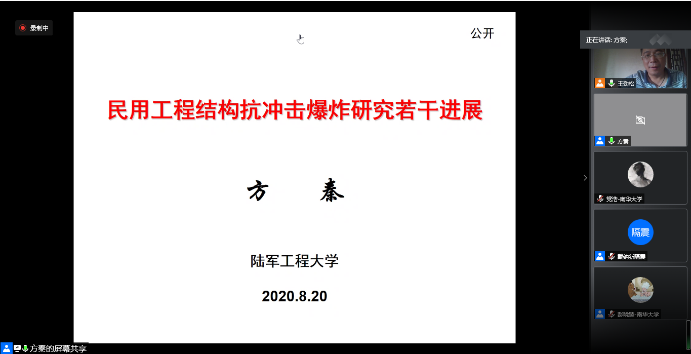 下午15:30,由陆军工程大学方秦教授作学术报告,题目为《民用工程结构抗偶然性冲击爆炸若干研究进展》,土木工程学院王劲松副院长主持。方教授的讲解内容主要包括抗爆基本知识和数值模拟方法。抗爆基本知识包括了建筑物抗恐怖爆炸袭击、燃油气等危化品爆炸灾害效应及防护、核电站结构抗大型客机撞击、提高结构抗爆能力的新材料新结构新技术和抗爆结构设计计算方法等,数值模拟方面则详细讲解了建模及分析方法。最后方教授回答了同学们提出的一些问题和想法。