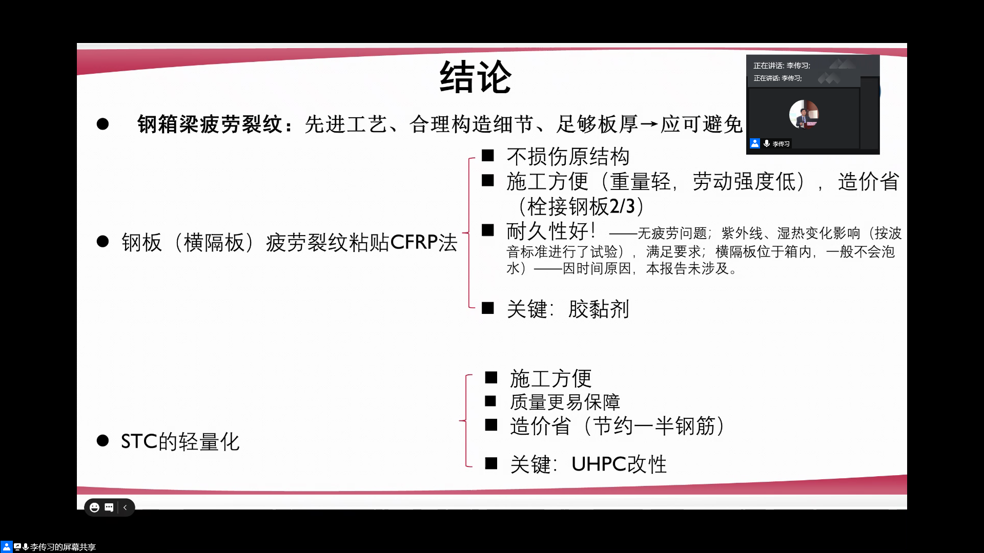 下午15:00至17:00,长沙理工大学土木与建筑学院院长李传习教授应邀,进行题为“正交异性桥面板钢箱梁的疲劳开裂及其处治新技术”的学术讲座。李教授就2006年建成通车的某悬索钢箱梁桥作为研究案例,结合工程研究所得的数据,分析产生的七种常见疲劳裂纹、起源、比重及其产生原因,还提出了相应的防止对策。经过长期的科研攻关,李教授团队研制了新型增强环氧胶黏剂,详细地展示了在疲劳加固的工程应用成果。学员们纷纷表示受益匪浅,被李教授团队的科研精神折服。