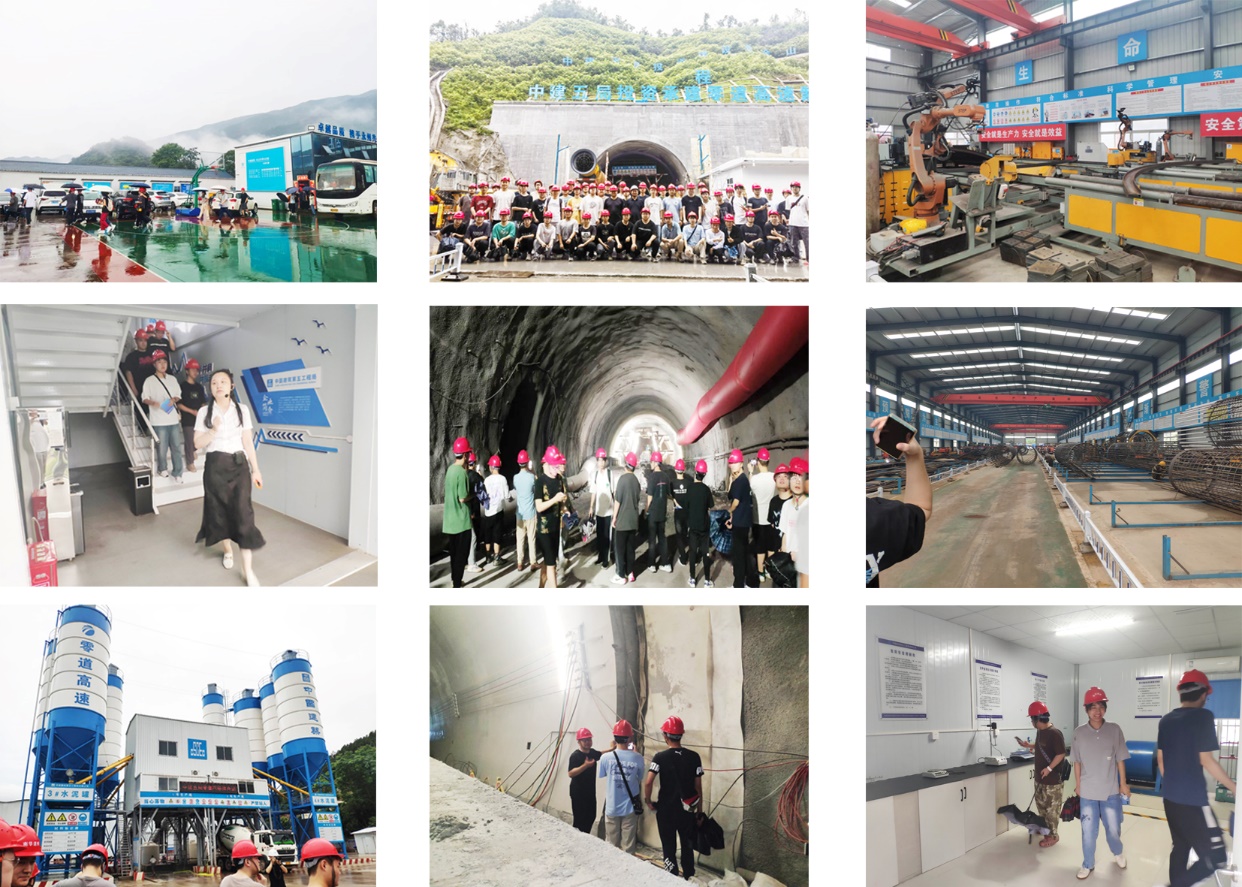 然后,项目总工程师瞿永和现场技术人员带领师生分别参观了绿色低碳项目部办公用房、紫金山1#、2#、3#隧道、智能化隧道钢拱架与钢筋网片加工中心、混凝土拌合站、桥梁钢筋加工中心及工地试验室等8处项目现场,从项目概况、施工工艺、现场管理、安全注意事项等方面进行讲解,并细心为学生现场解疑。