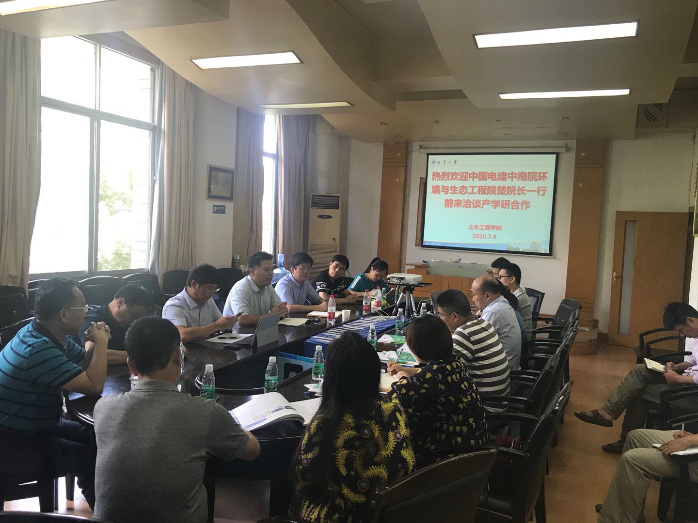 2020年7月4日上午10:30,中电建环保科技公司&中电建中南院环境与生态工程院楚凯峰副院长、俞立红副总工程师(98级给排水专业校友)、水务所谭艳忠所长一行,前来beat365洽谈产学研合作,学院领导、教务办、市政工程系和市政环境实验室的老师参加了此次合作交流,会议由学院副院长王劲松教授主持。
