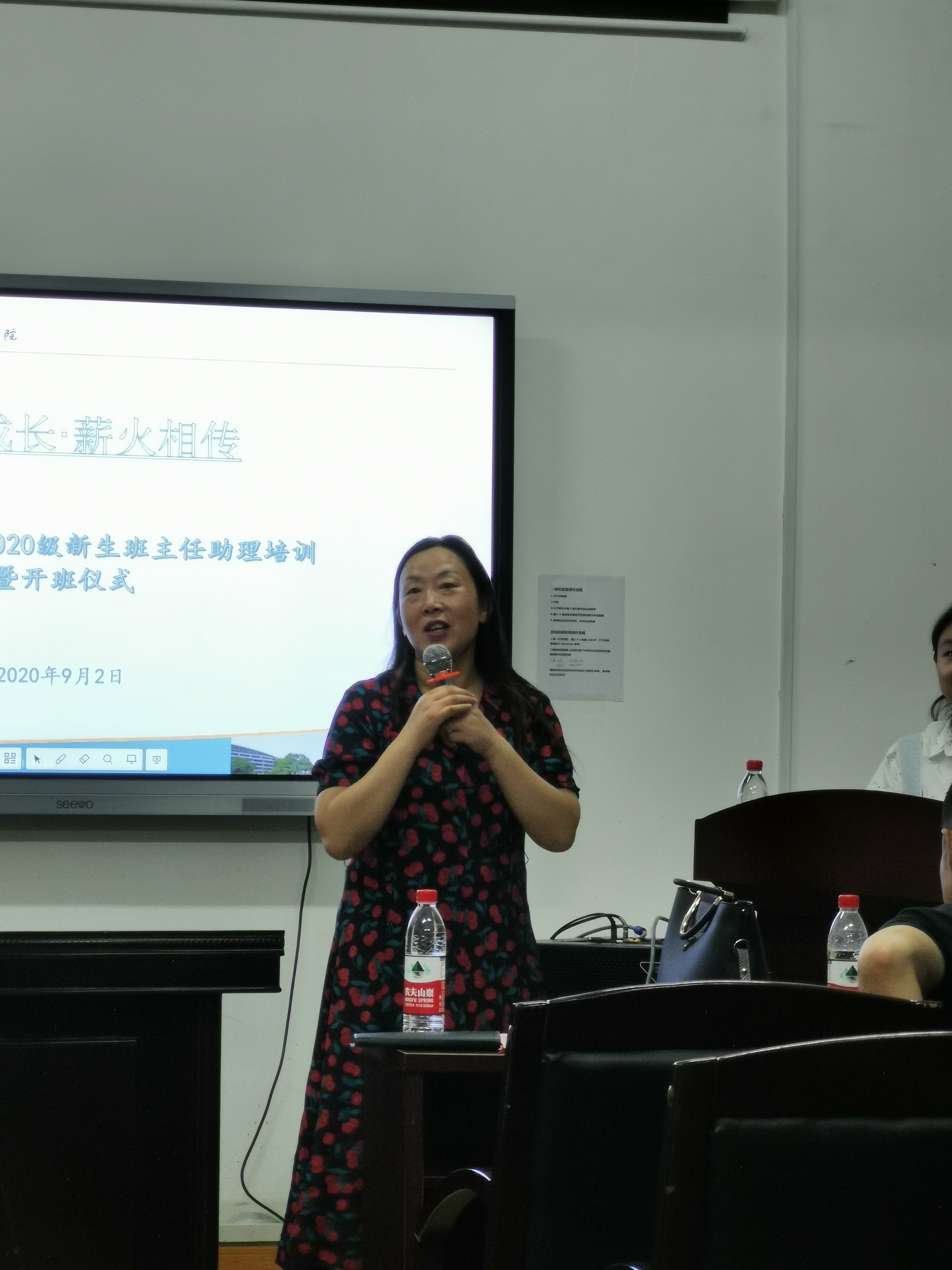 会议伊始,由主持人逐一的介绍与会成员;随后,由2019级班助代表袁彬、焦越与兰旺进行带班的经验分享,他们从新生的学习、宿舍生活、娱乐等方面各个方面逐一开始介绍。他们强调要熟练流程并能很好的回答班上同学的问题,了解同学们的生活习惯,树立正确的学习理念,能与班上同学们友好的相处;紧接着,进入了新老班助互动答疑的环节,新的班助们积极的向三位有经验的老班助同学提出问题,三位班助同学也能顺利的解答,共同探讨如何当好一个班助;之后,由新生班助代表郑蕙晖发言,表达了希望能帮助新生同学们过渡到大学生活的期望,与能完成关照新同学任务的决心;接着,张孝磊老师和刘华老师进行了短暂的交流环节,对我们前几届班助同学的表现表示了肯定,对新班助提出了要有细心、耐心、责任心的要求,提醒班助要多与新生同学交流,指导新生参加社团活动,让新生同学们少走弯路,多与班主任沟通报告,达到一个“薪火相传”的目标;最后,由唐素芝老师进行总结性的发言,她强调在当班助的途中要有传承的目的并与新生们共同成长、提高自我的认同感,希望所有班助同学在当班助的途中能达到成长的目的,提高之后在找工作方面的能力,并在当班助的责任压力下尽快成长,知晓新生情况,呵护新生成长,并让每位新生班助思考任何做好一个班助。