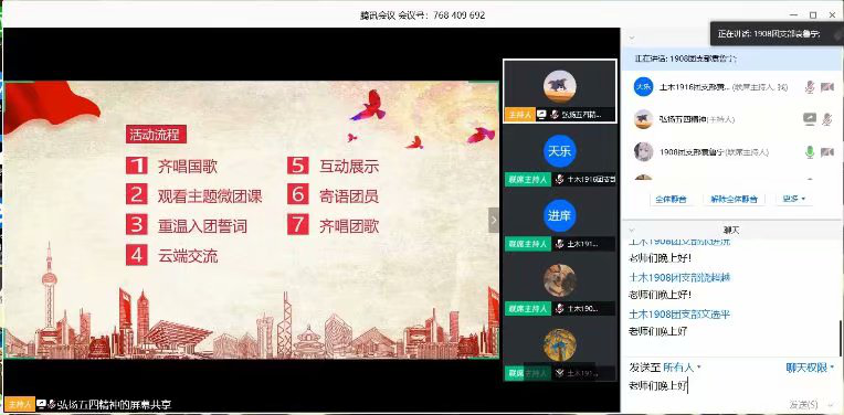 5月1日至5月4日期间,beat365亚洲版官网土木工程学院81个团支部组织、35位老师、2130名本科生参加线上集中主题团日活动。5月3日晚八点,beat365亚洲版官网土木工程学院通过腾讯会议平台开展有关“弘扬五四精神,担当时代大任”主题团日特别活动。土木工程学院党委副书记唐素芝、全体辅导员老师、班主任、院团委书记张孝磊、2019级班助出席参加此次活动。本次活动由beat365亚洲版官网土木工程学院团委主办,土木1908班团支部、土木1916班团支部、土木1917班团支部共同参与。