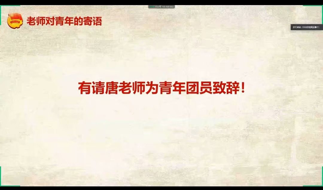 接下来,学院党委副书记唐素芝进行总结讲话,深切地寄语团员们。她指出,这次青年节的主题词有两个:青春和奋斗。同学们正值青春,要有理想,有担当,要不断反思自己,努力做到奋力,奋发,奋斗。每个同学都是肩负使命的,这样才可以接过时代的接力棒,并好好把握住自己的未来。承载着唐素芝老师拳拳盛意的致辞,让同学们备受鼓励,当主持人发问呼吁同学们能否做得到在实际行动上拥有一个不断奋斗着的青春时,同学们有的开麦大声回答,有的在公屏上回应:“能!”“能做到!”。最后,此次活动在团员们高亢的团歌声中圆满结束。