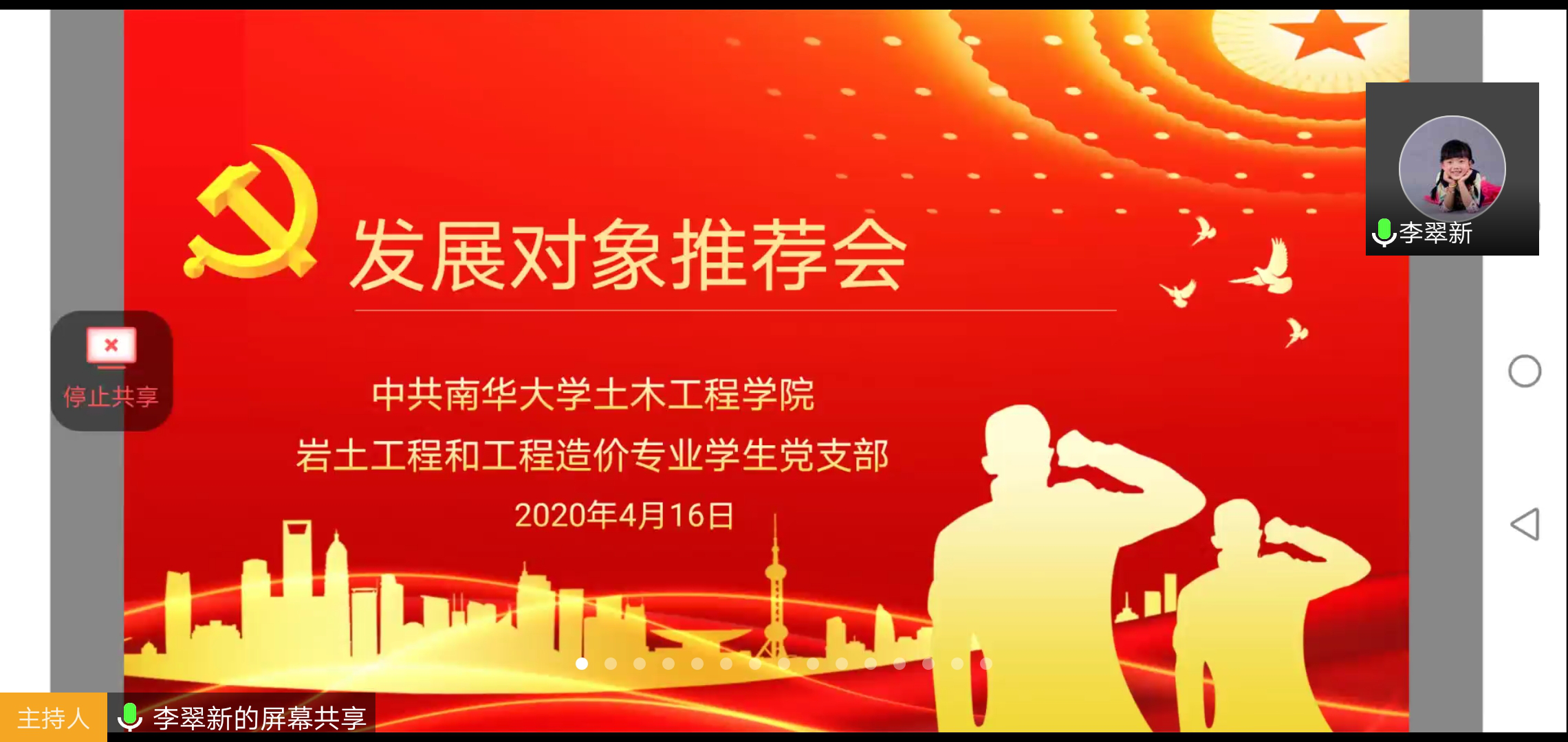 2020年4月16日下午,土木工程学院岩土工程专业和工程造价专业学生党支部通过腾讯会议线上召开了发展对象推荐大会,会议由党支部书记李翠新老师主持、支部全体党员以及班级群众代表参加了会议。