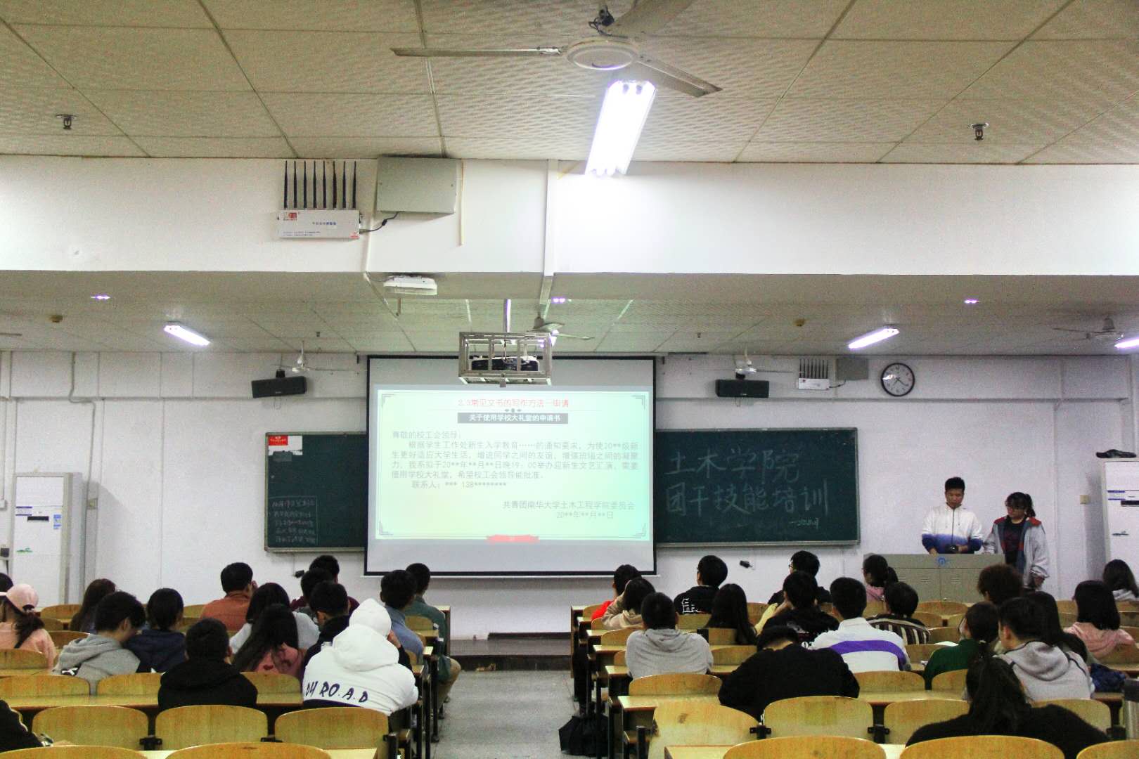 培训会议由两部分组成。会议伊始,由宣传部副部长丁喜正主持学生干部写作文书培训,丁喜正就文件格式字体字号标准、写作排版要点、落款、标题规范进行一一讲解。进而,丁喜正又从工作计划、工作总结、申请、会议记录四个角度对常见书写写作方法分点讲解,至此,写作文书培训结束。