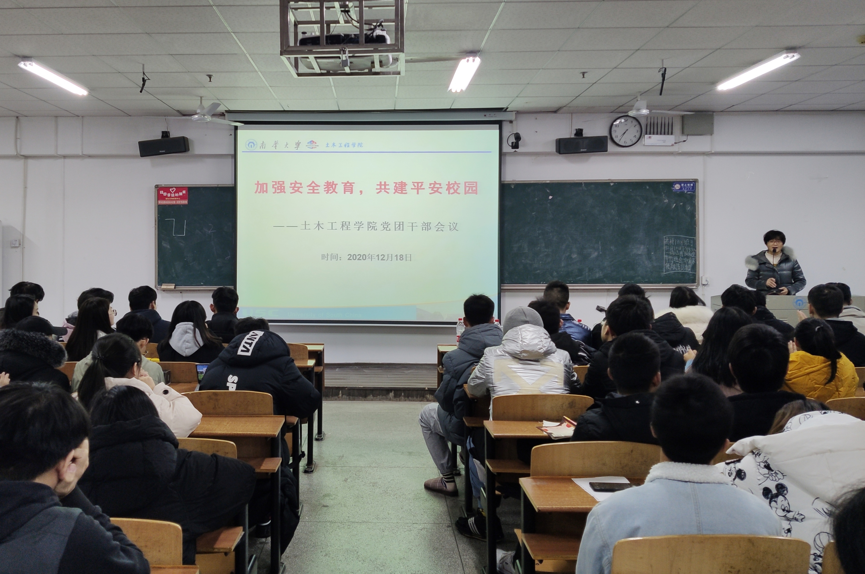 2020年12月18日晚七点半,土木工程学院于南华楼412教室召开以“加强安全教育,共建平安校园”为主题的党团干部会议。土木工程学院党委副书记唐素芝、学工室主任李翠新、辅导员老师贺淑珍、彭兴明、刘华、邓都、团委书记张孝磊出席本次会议。各支部全体党员、各班班长团支书、团学会各部门部长、团学会学社联主席团共同参与此次会议。会议由李翠新老师主持。