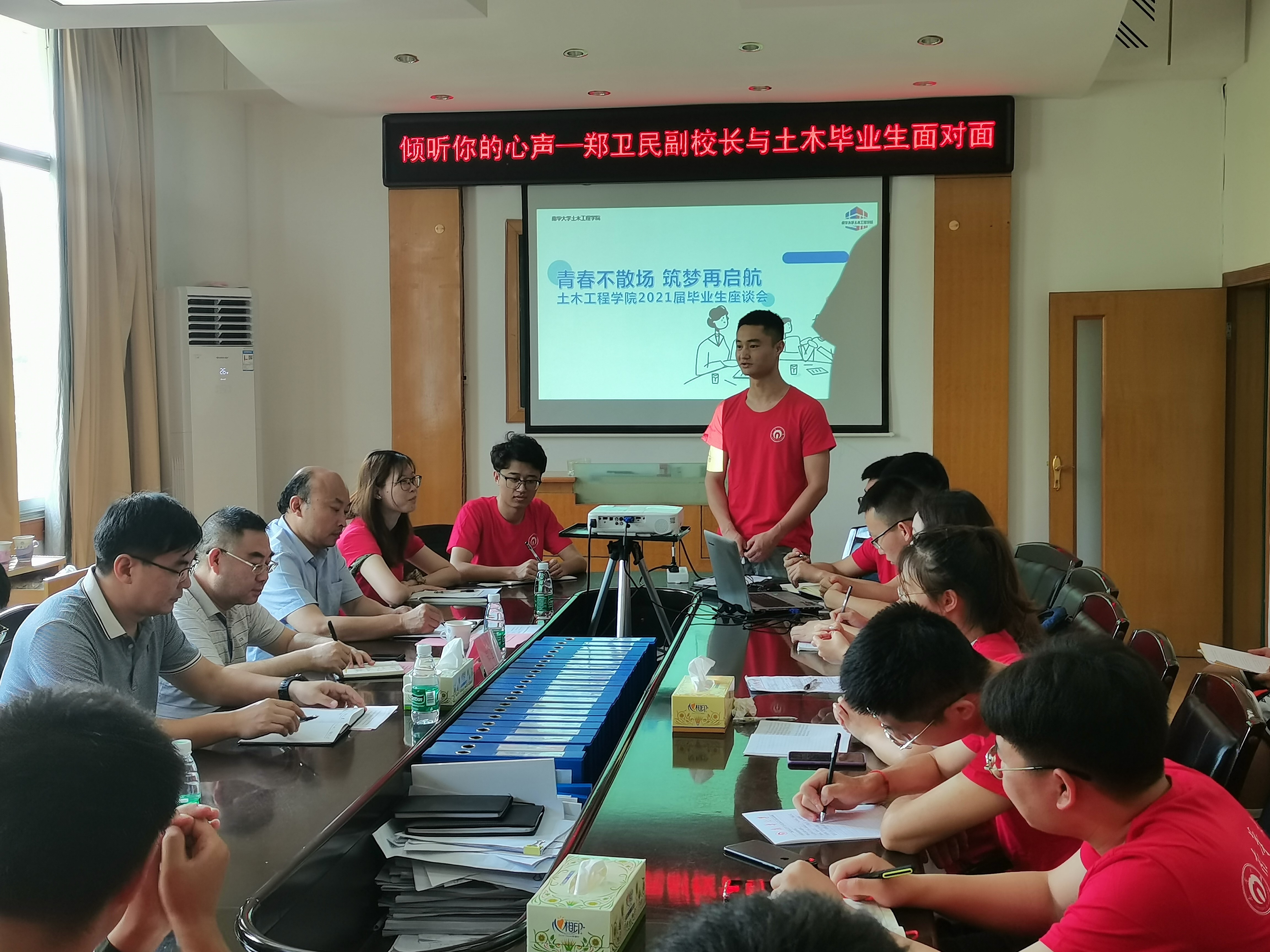 6月9日中午12时,土木工程学院2021届毕业生座谈会于土木楼三楼会议室准时召开!beat365亚洲版官网副校长郑卫民,土木工程学院党委书记陈振富、院长谢东、副书记唐素芝、副院长刘清共同出席活动。