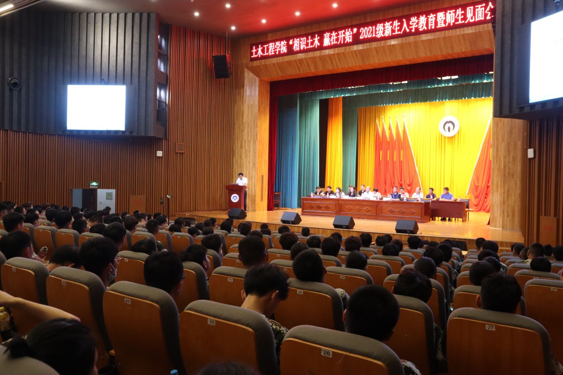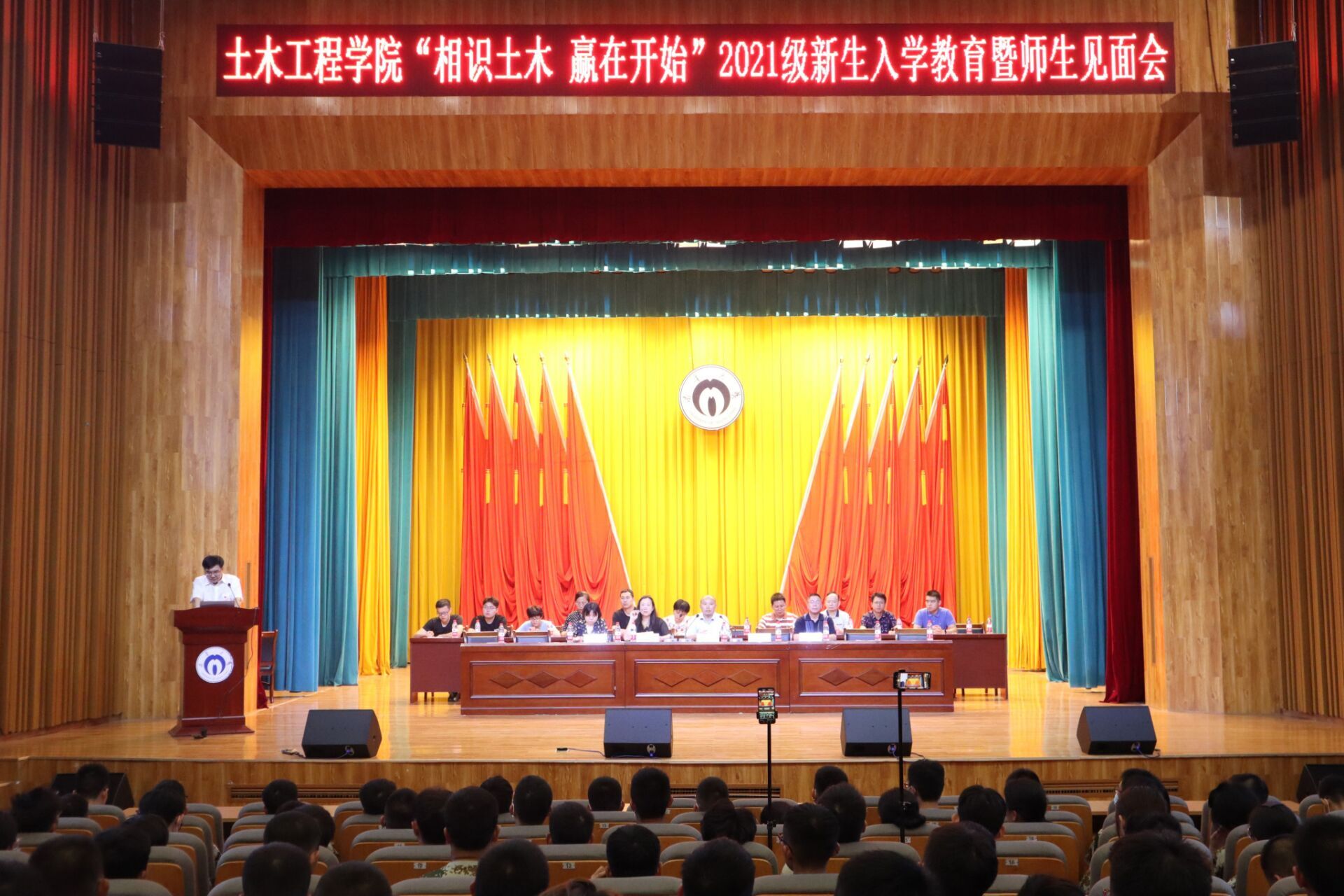 beat365亚洲版官网土木工程学院“相识土木•赢在开始”2021级新生入学教育暨师生见面会于2021年9月12日在南校大礼堂举行。土木工程学院党委书记陈振富、院长谢东、党委副书记唐素芝、副院长王劲松、副院长刘清,各系室主任、教师及学工室全体辅导员老师出席会议。2021级班助及全体新生共同参加此次大会。