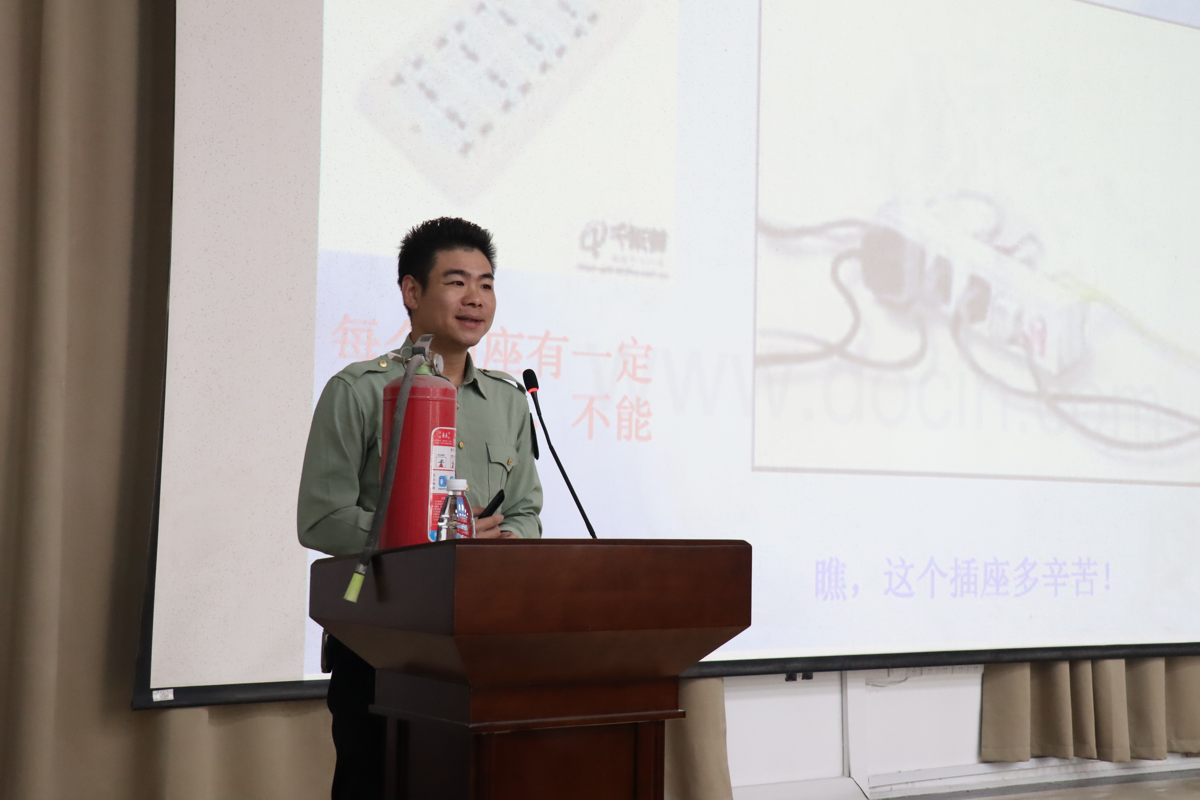 首先,张鑫警官向大家播放生活中火灾实例的视频,视频中一幕幕危险的情形惊动着大家的心,教训深刻、发人深省。接着,张警官就视频中的情况,为大家详细讲解了火灾发生时的注意事项,在场人员均全神贯注、认真聆听,深刻认识到消防安全的重要性。随后,张警官指出生活中各类电器所存在的安全隐患,并告诉大家电器的正确使用方法。同时他还介绍了灭火器的各种类型并亲自为大家演示如何正确使用灭火器。最后,张警官提醒大家应做到人走电断,并且希望大家做好“二传手”,将学到的消防安全知识教给他人,切实做到防患于未然,全力保障人身安全。