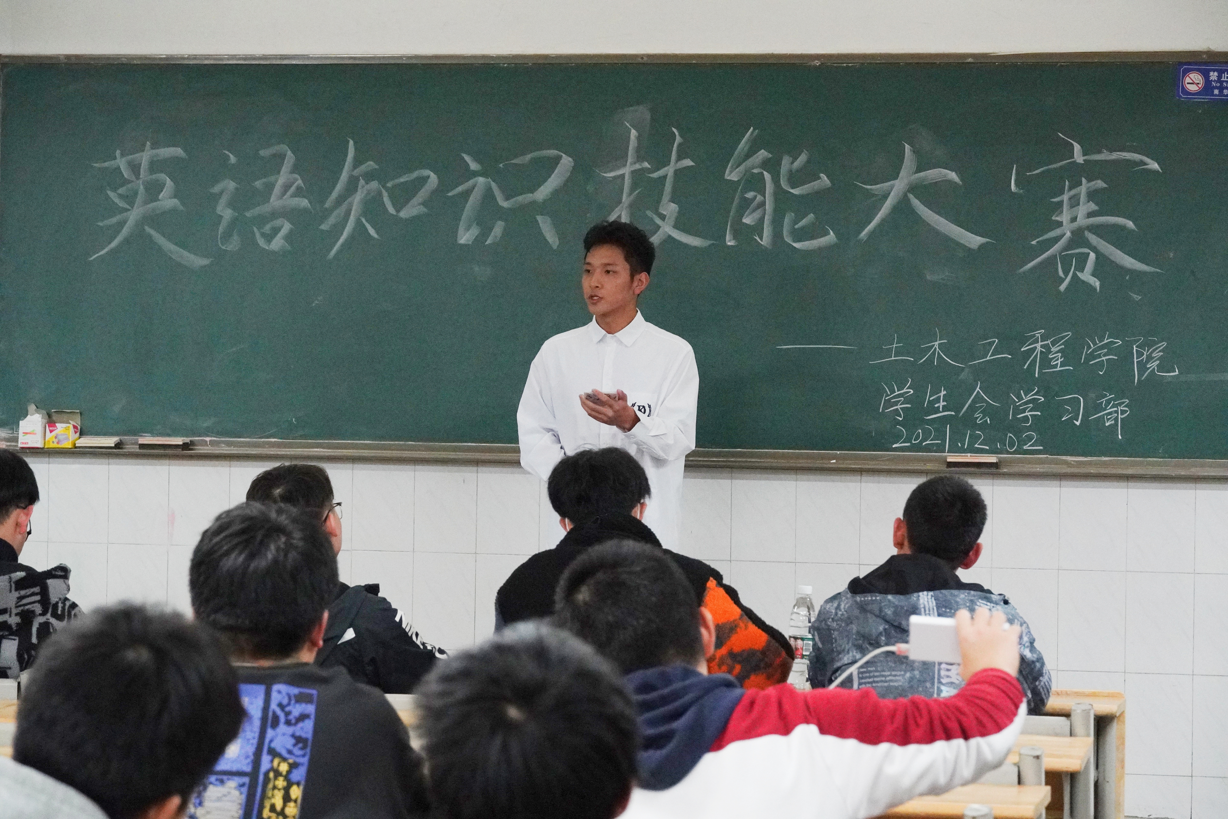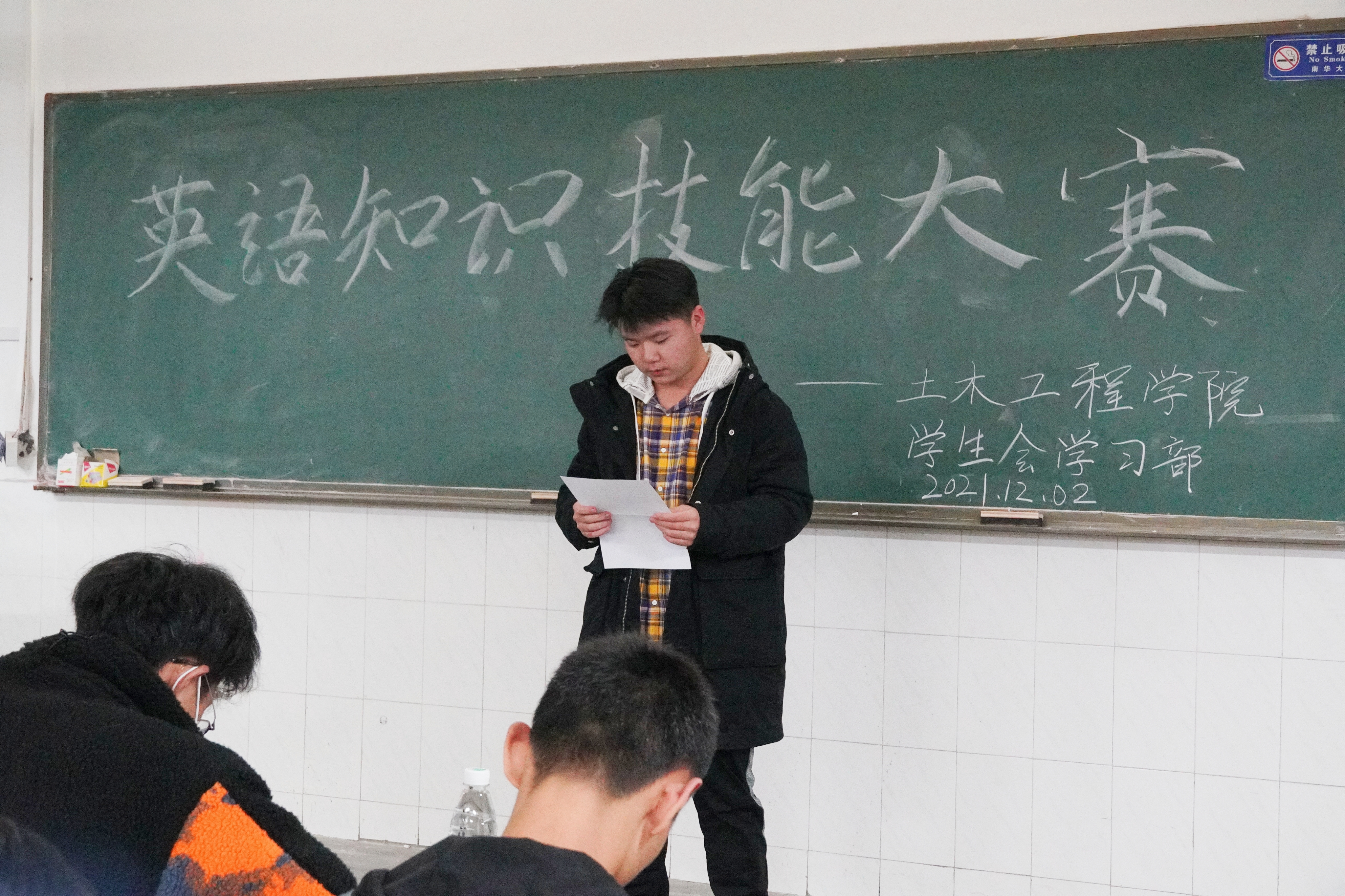 2021年12月2日晚7点,土木工程学院于核学楼四楼举办英语知识技能大赛。三个教室分别由唐李伟、沃屹坤和龚俊主持。本次活动邀请院团委、学生会各部门代表作为评委,19、20、21级部分同学参与了本次活动。