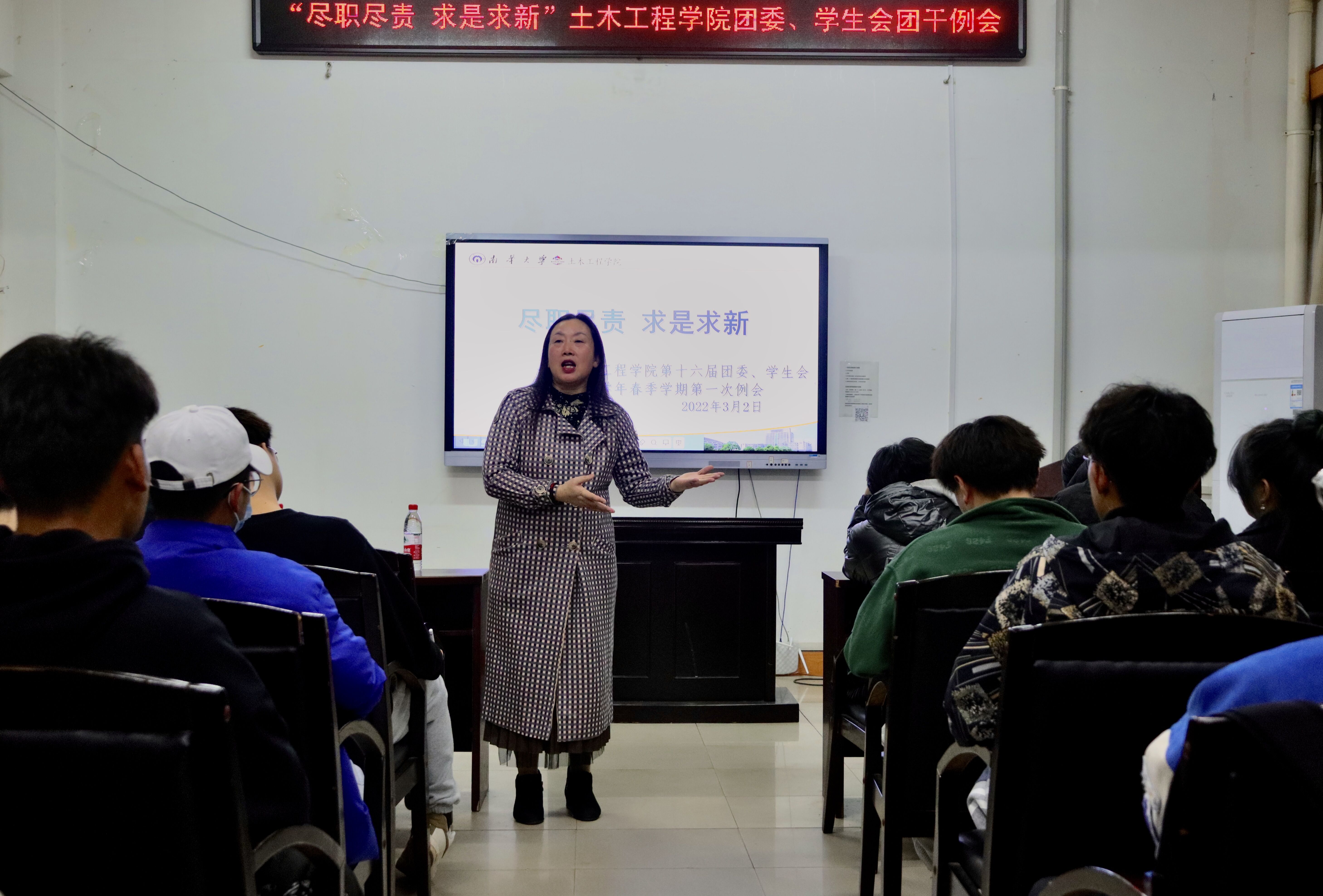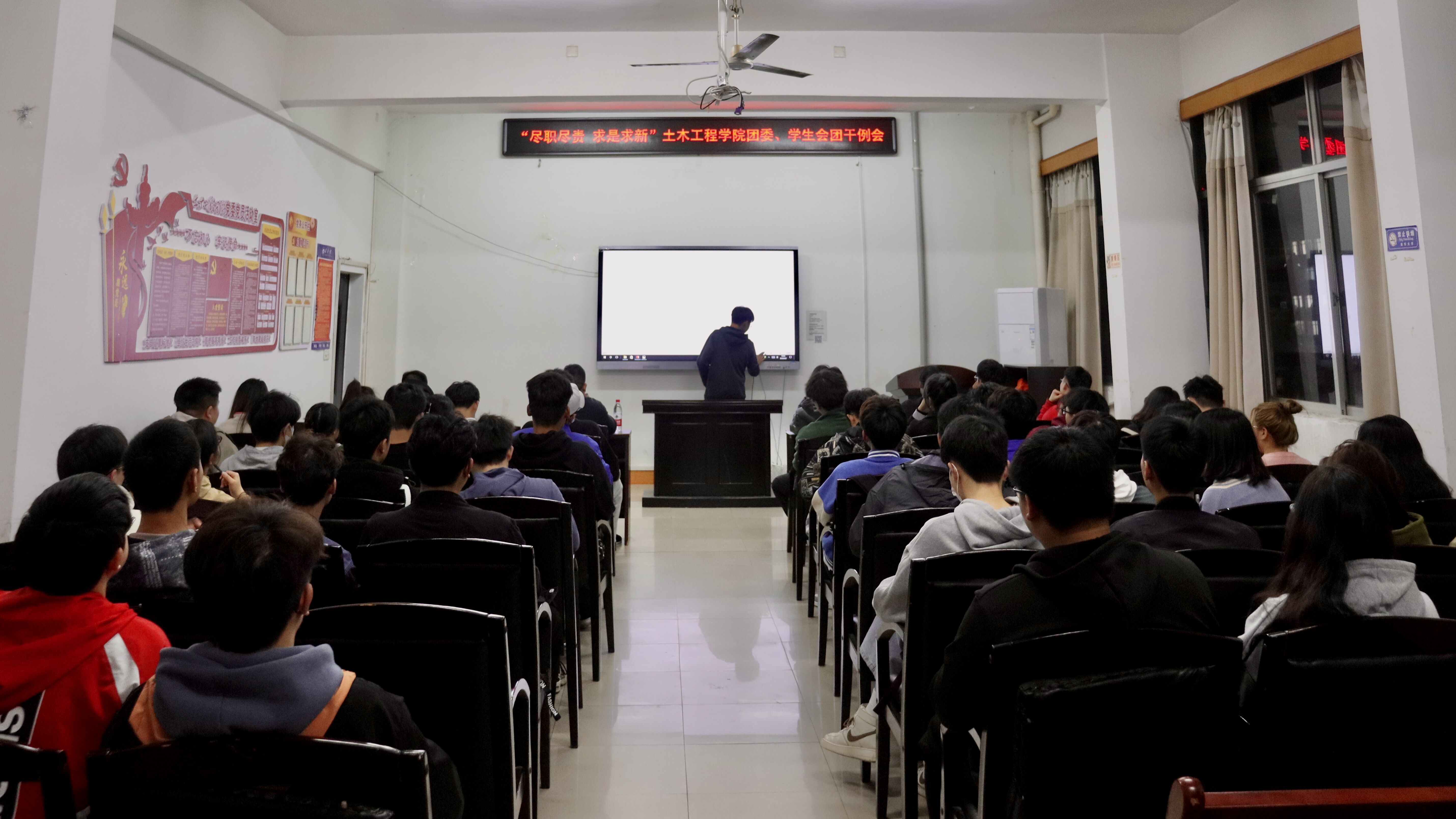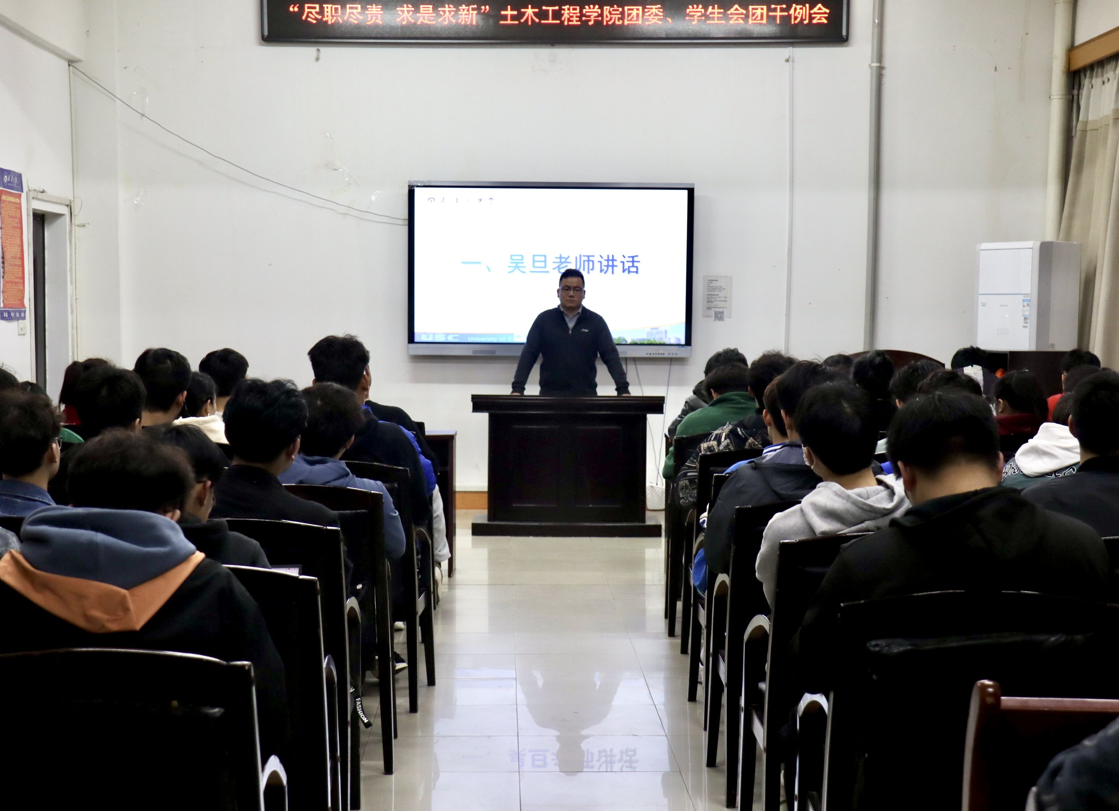 紧接着,学生会主席张钞与院团委副书记罗贵庭分别就第二课堂与部门老干事考核提出春季学期革新具体举措。会议最后吴老师就“尽职尽责求是求新”主题进行了详细解读,向各位团干提出新学期新要求,着重强调学风建设,希望各团学干部合理规划时间,做到学习、工作两不误,同时他也相信在各位团干的带领下,土木工程学院定能乘风破浪,再创佳绩,至此,本次团干例会圆满结束。