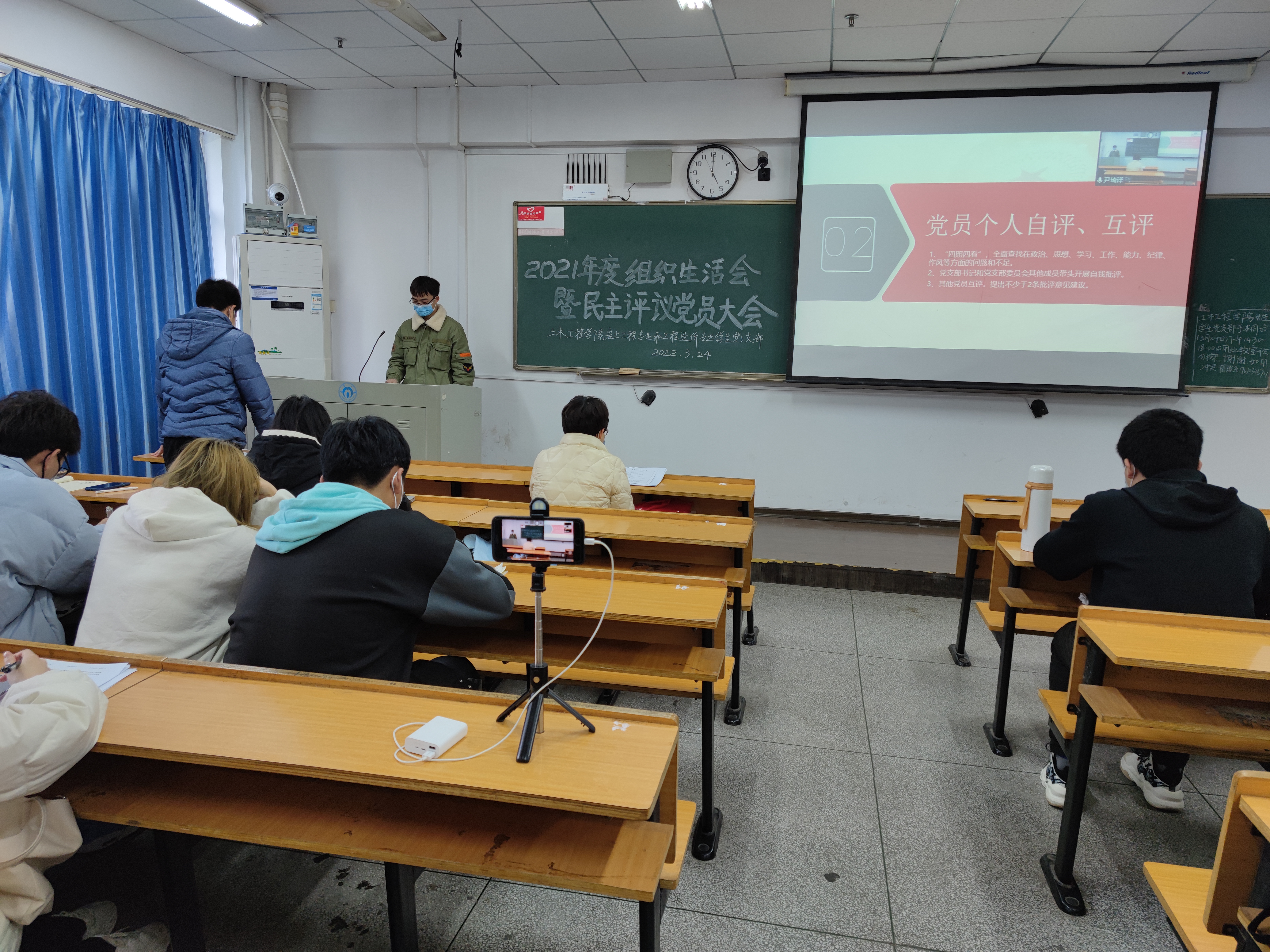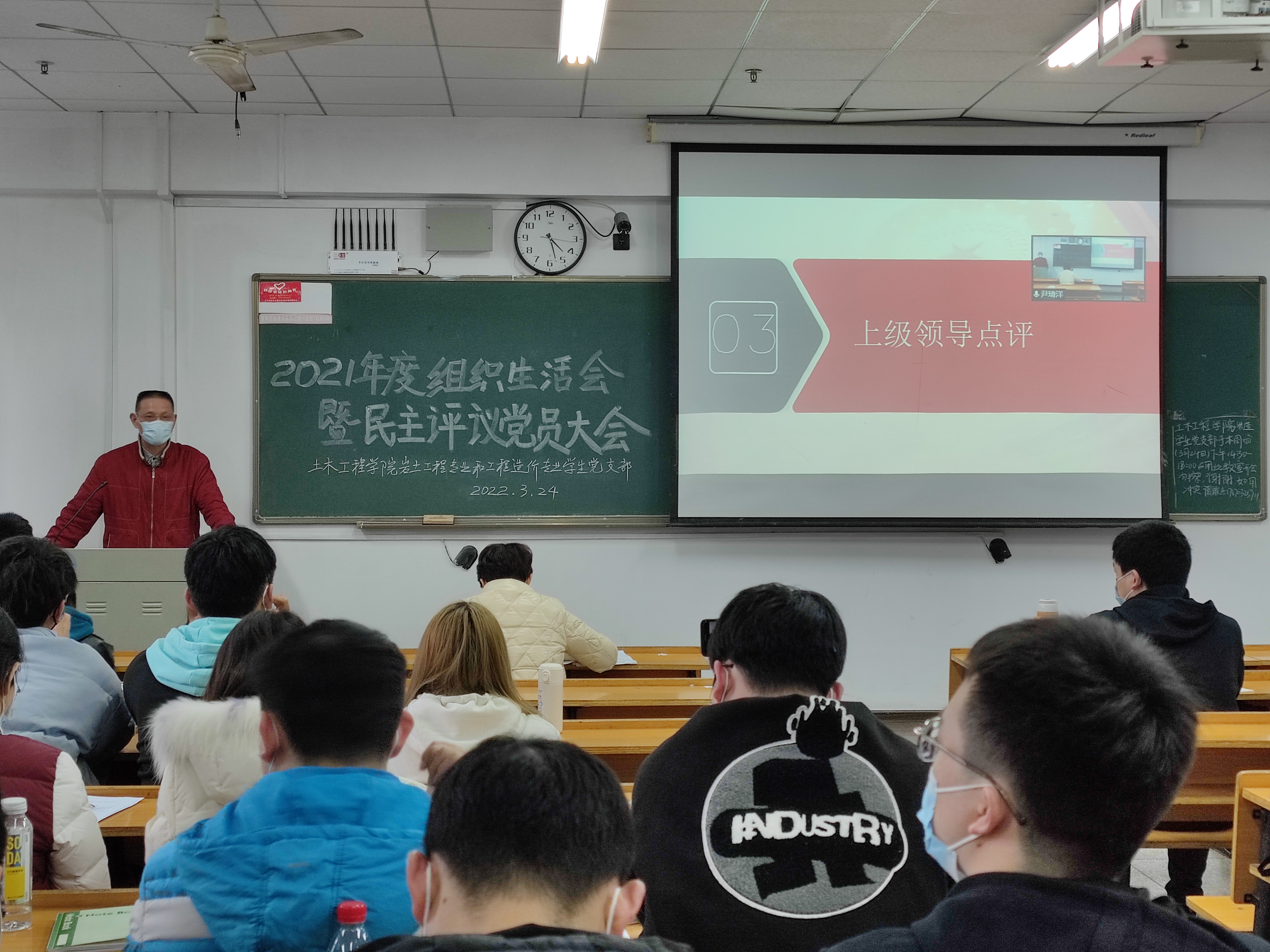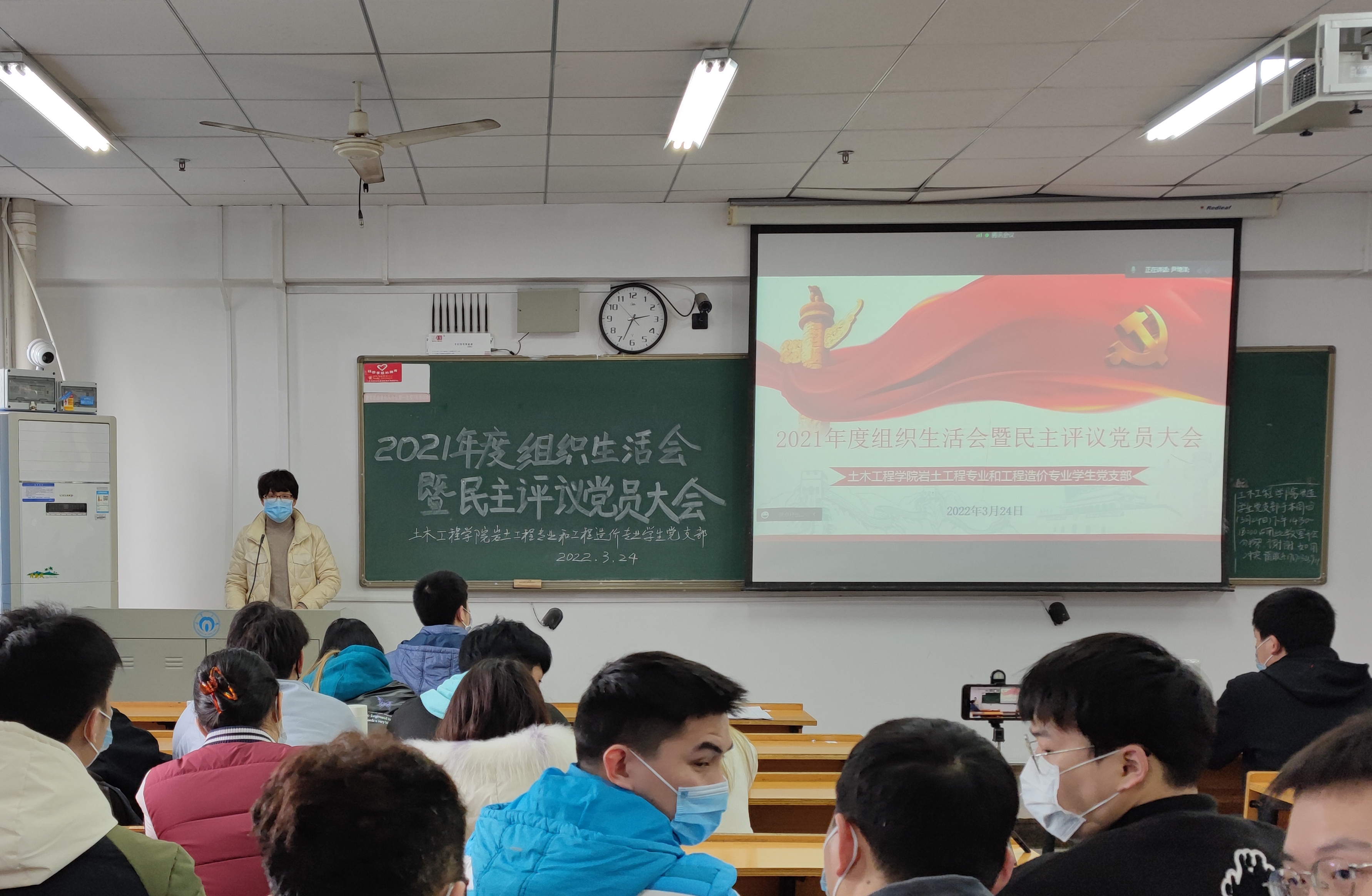 2022年3月24日14:30,土木工程学院岩土工程专业和工程造价专业学生党支部在一教402召开2021年度组织生活会,并开展民主评议党员工作。会议由支部书记李翠新老师主持,院党委书记石建军老师到会指导点评,支部全体党员参加会议。