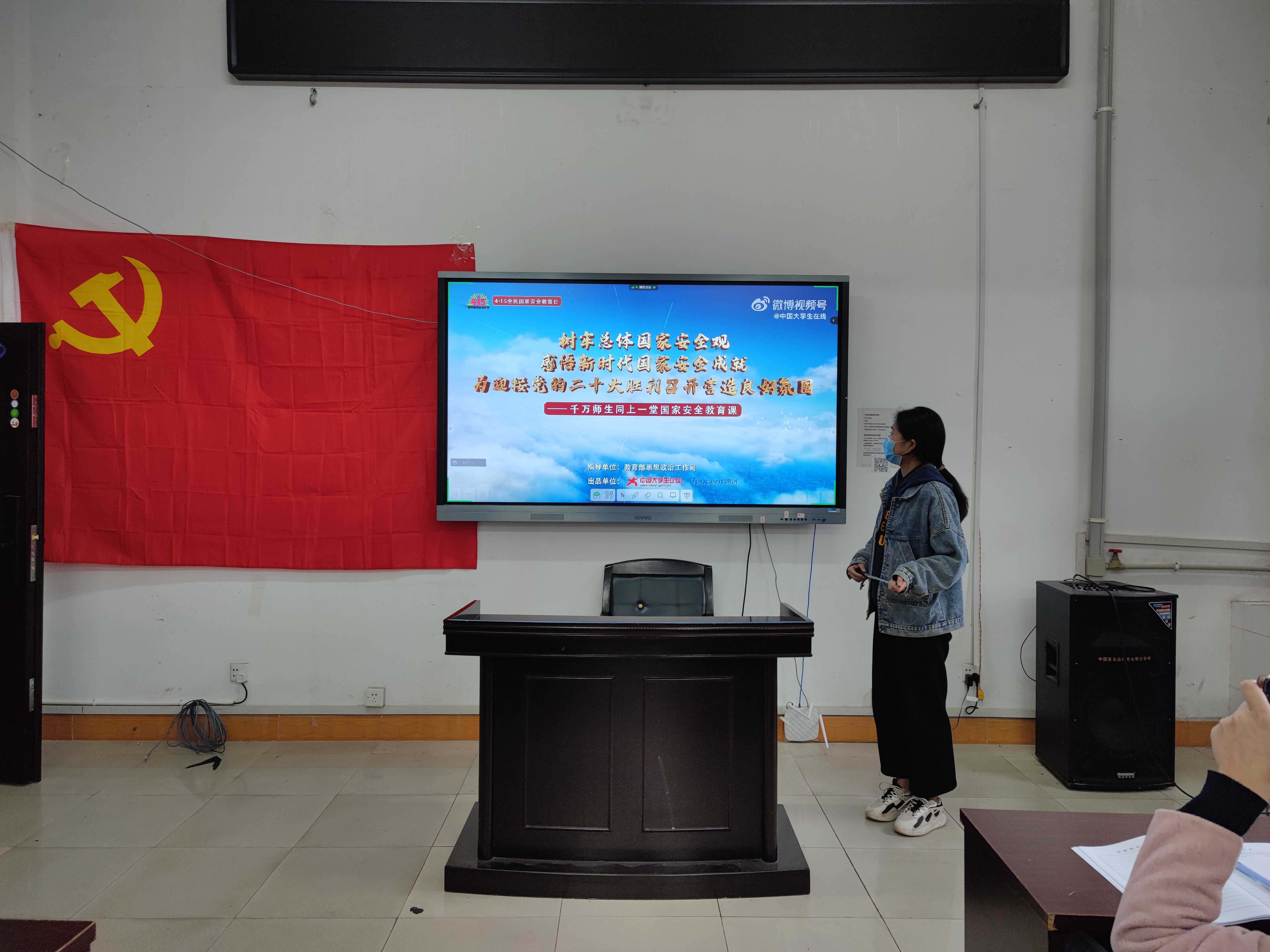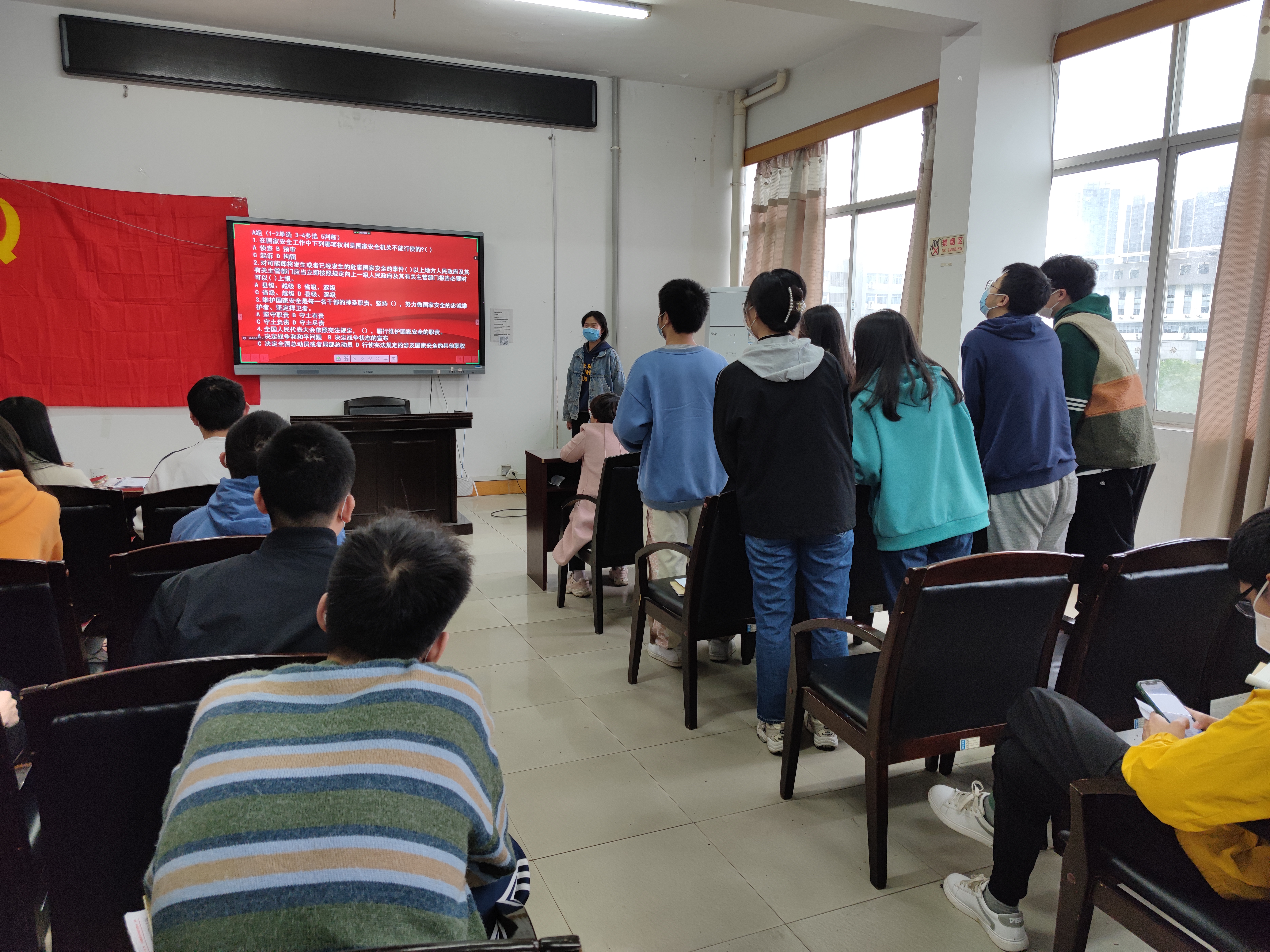 首先,全体党员一起观看“千万师生同上一堂国家安全教育课”,这堂课由北京大学保卫部部长赵冠英、腾讯守护者计划安全专家张文涛、2021年全国“最美高校辅导员”山东大学辅导员薛冰、北京师范大学2019级本科生刘懿莹联合讲授。通过学习,全体党员对新时代国家安全的丰富内涵,日常生活中维护国家安全、规避安全风险的有效方法有了进一步的认识和了解。随后,现场举行国家安全知识竞赛,全体党员分组抽题答题,竞赛成绩计入党员积分,促进了党员们对国家安全知识的掌握。