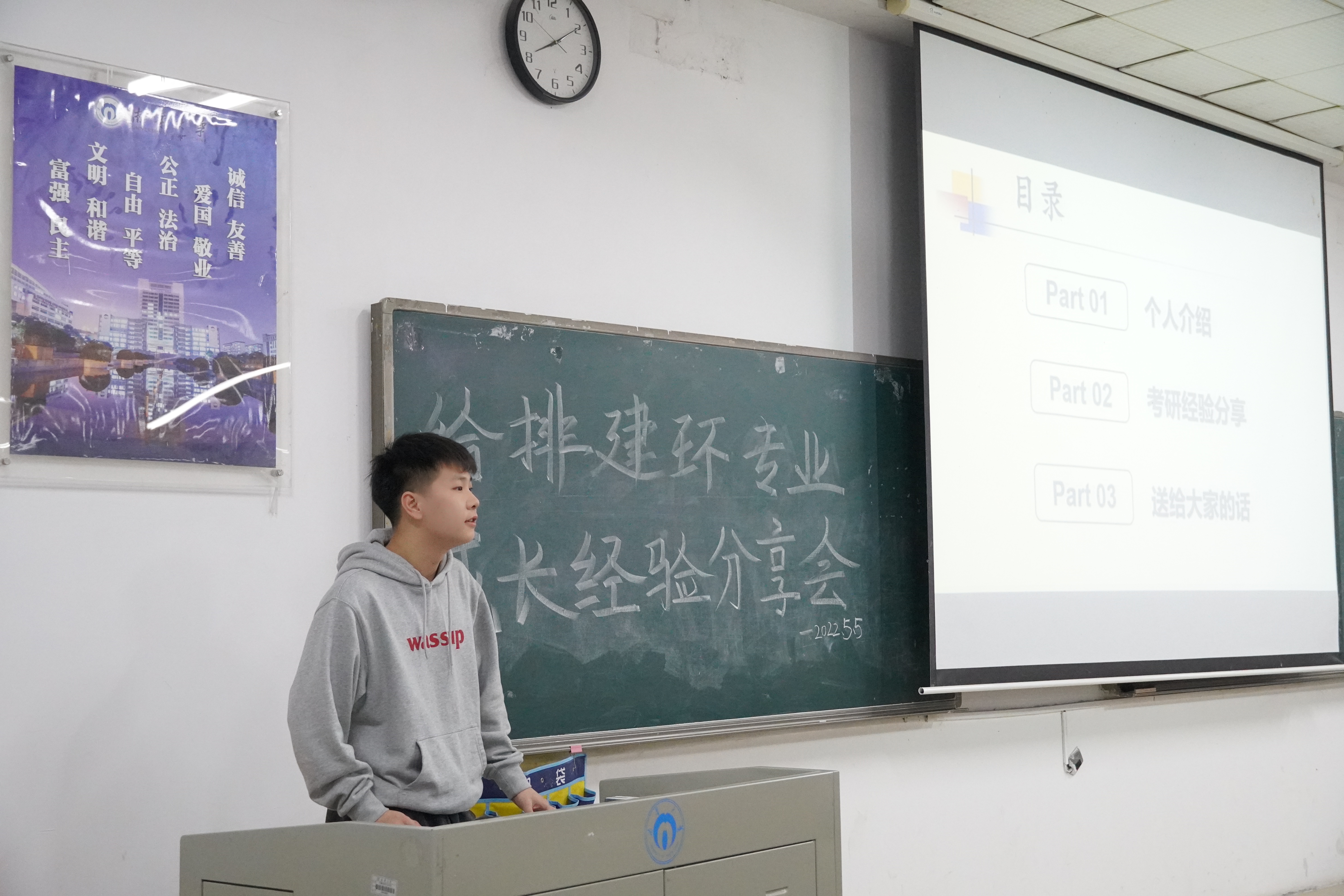 2022年5月5日晚上20:00,给排建环专业于beat365亚洲版官网第一教学楼111室,以“朋辈携手,齐头并进”为主题开展成长经验分享会。与会人员有辅导员贺淑珍老师、六位2018级学姐学长以及给排建环专业2019级全体学生。会议分为三项。
