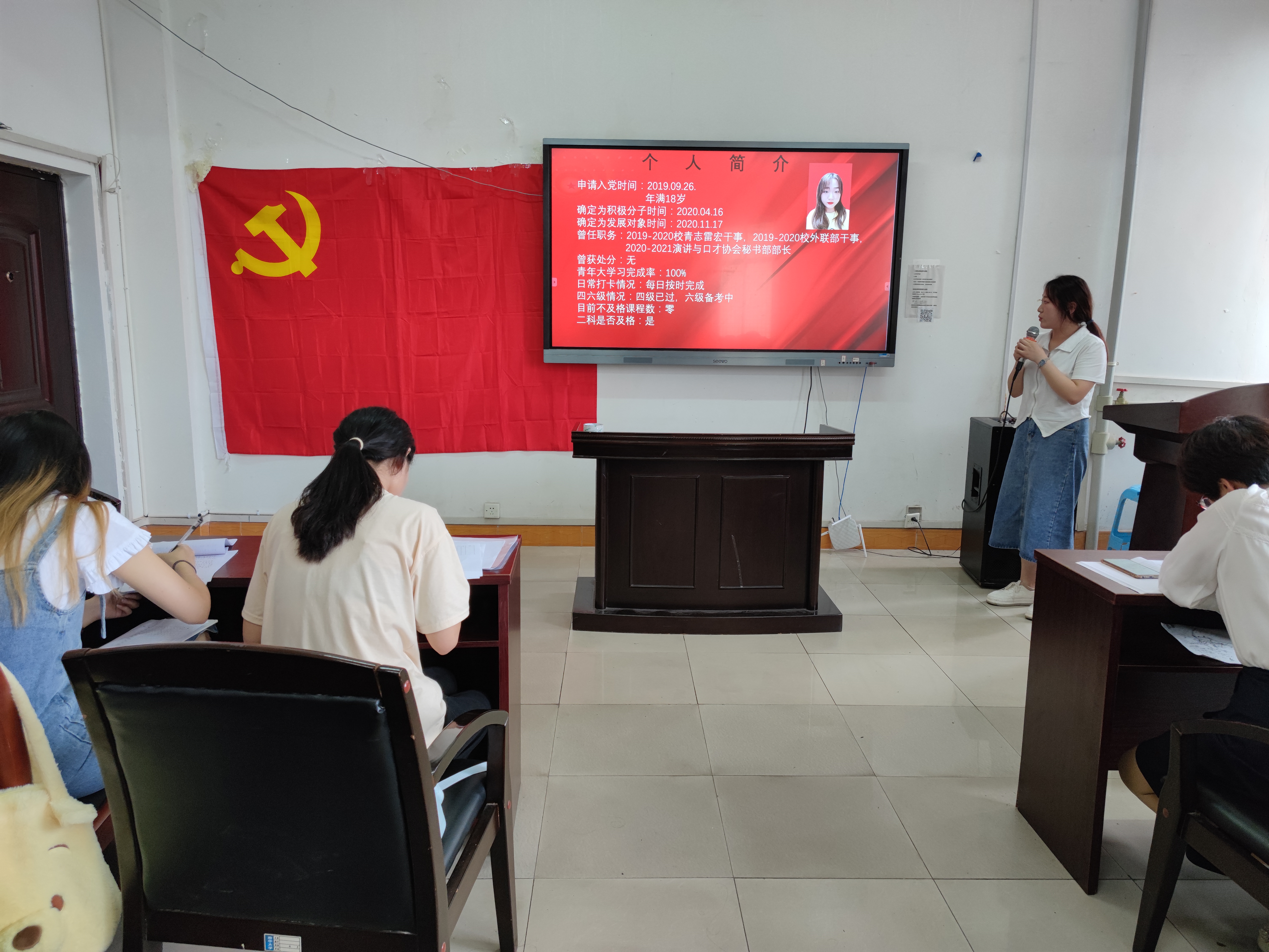 会议伊始,支部书记李翠新老师强调了推优答辩会的目的、要求和流程。随后,拟发展对象分两组依次进行个人陈述和现场答题,他们结合自身情况,围绕思想政治、学习工作、获奖情况、志愿服务、青年大学习等多方面情况进行陈述。接着由小组代表随机抽取一个题目,发展对象依次现场答辩,大部分发展对象针对所抽题目进行了逻辑清晰、具有党性修养的回答。与会人员根据发展对象汇报及答辩情况,本着严肃负责的态度进行评议推荐,并通过无记名投票方式进行推选。支委会成员及党员代表根据汇报、投票情况,结合平时思想、学习和工作等方面的表现进行综合考量,最终确定钟华杰等7名同学为2022年上半年拟发展对象,报上级党组织预审。