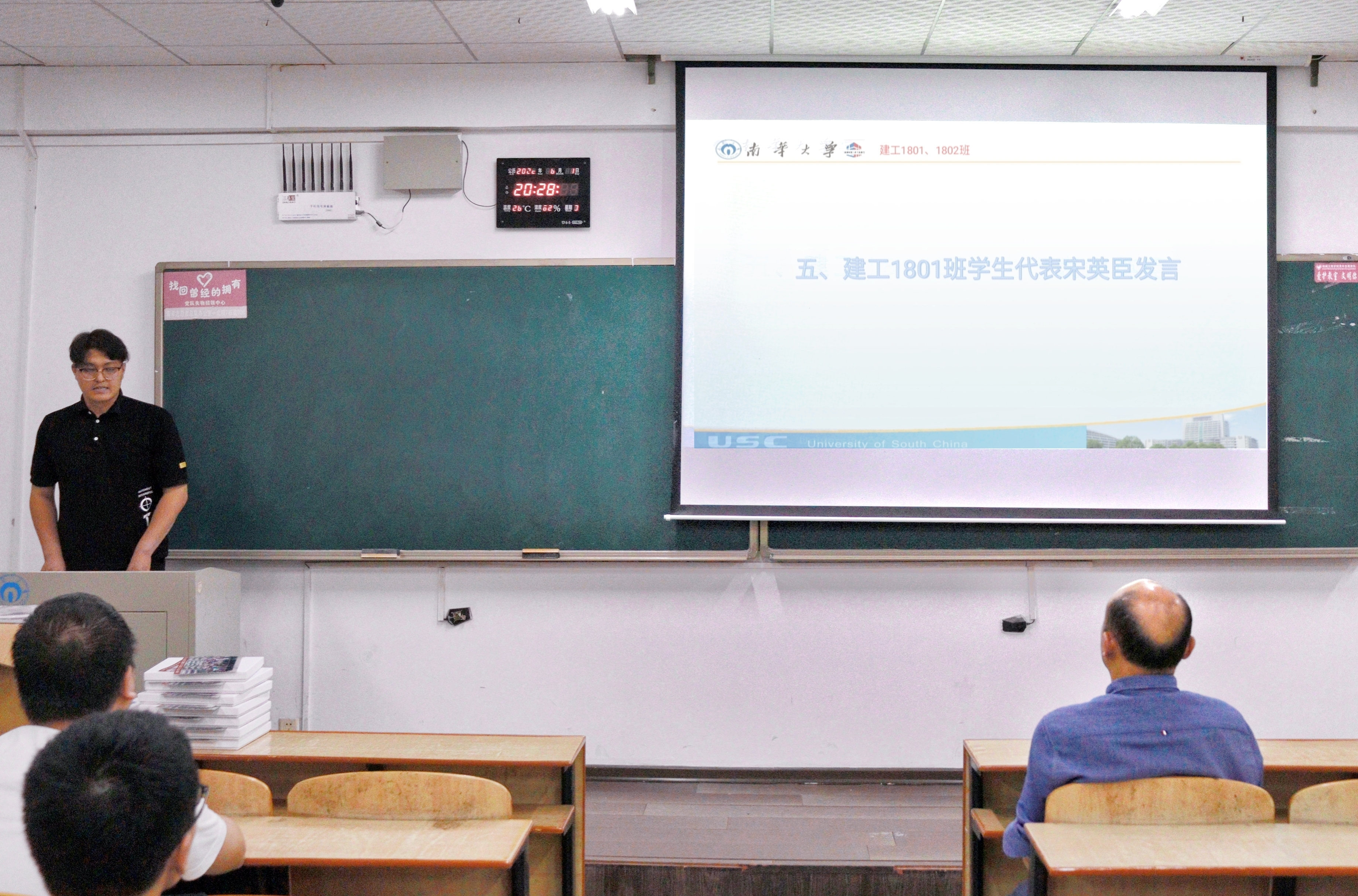班会第二环节,两名学生代表上台发言。建工1801班宋英臣发言中表示,感谢大学四年里各位老师的栽培以及同学们的陪伴,并与同学们分享了自身实习工作的经验,希望大家保持终身学习的态度,坚定信念,不忘初心,继续发扬土木人“砖瓦造福、求实求真”的精神,在新的起点继续为理想努力奋斗。建工1802班梁逸锐则结合自身经历给出了三点建议:第一,要把专业知识和技能与社会实践相结合;第二,要学以致用,不断增强自身技能;第三,要勇于担当,用实际行动为建设社会主义现代化强国贡献力量。