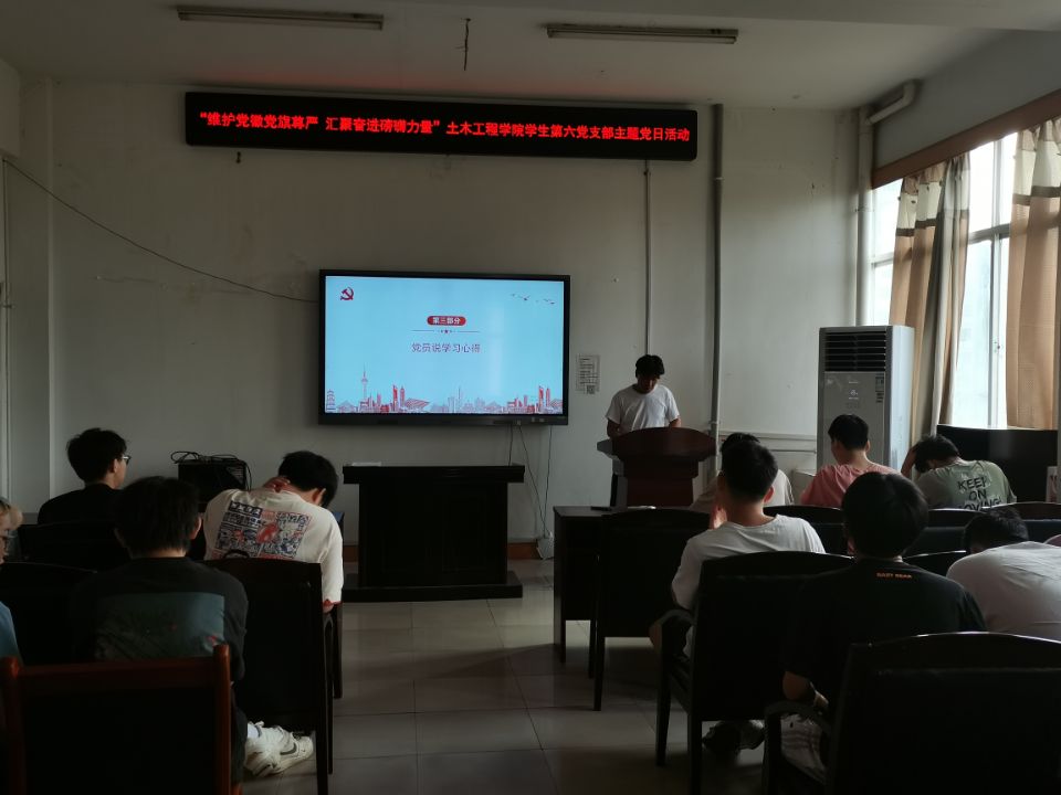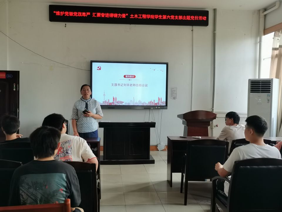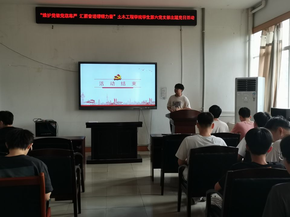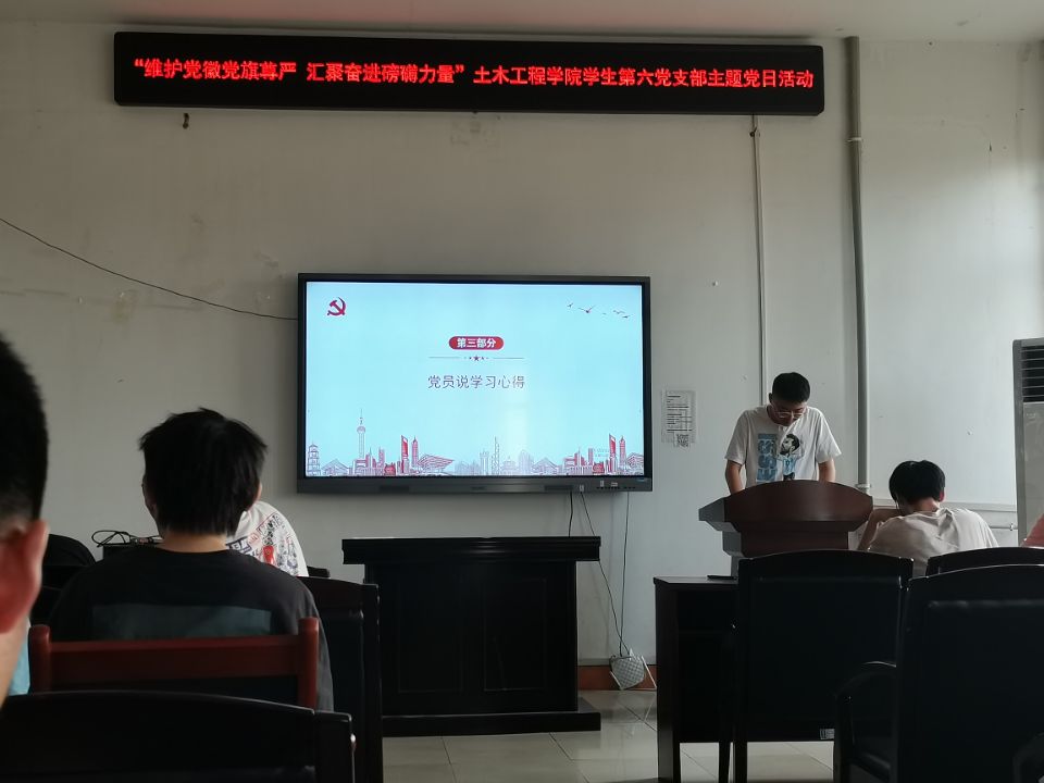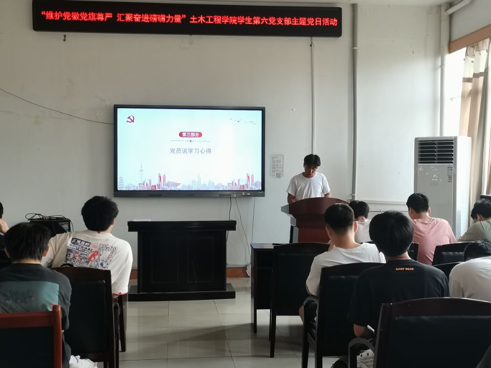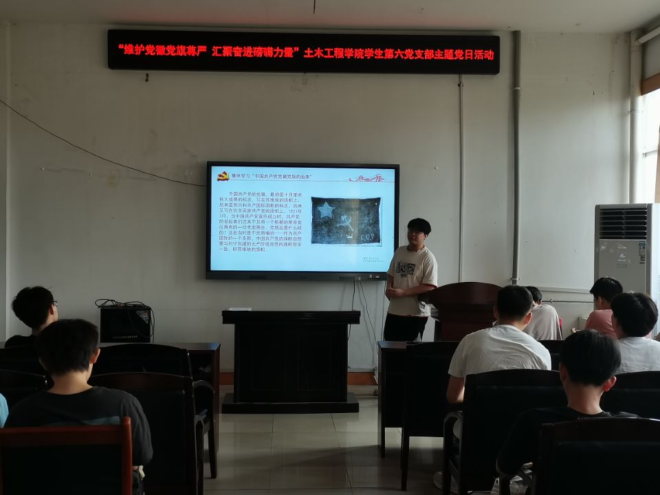 2022年6月27日15:00,土木工程学院学生第六党支部于土木楼四楼会议室举行“维护党徽党旗尊严,汇聚奋进磅礴力量”主题党日活动。本次会议由宋章明同志主持,支部书记刘华老师及支部全体学生党员参加,共分四项进行。