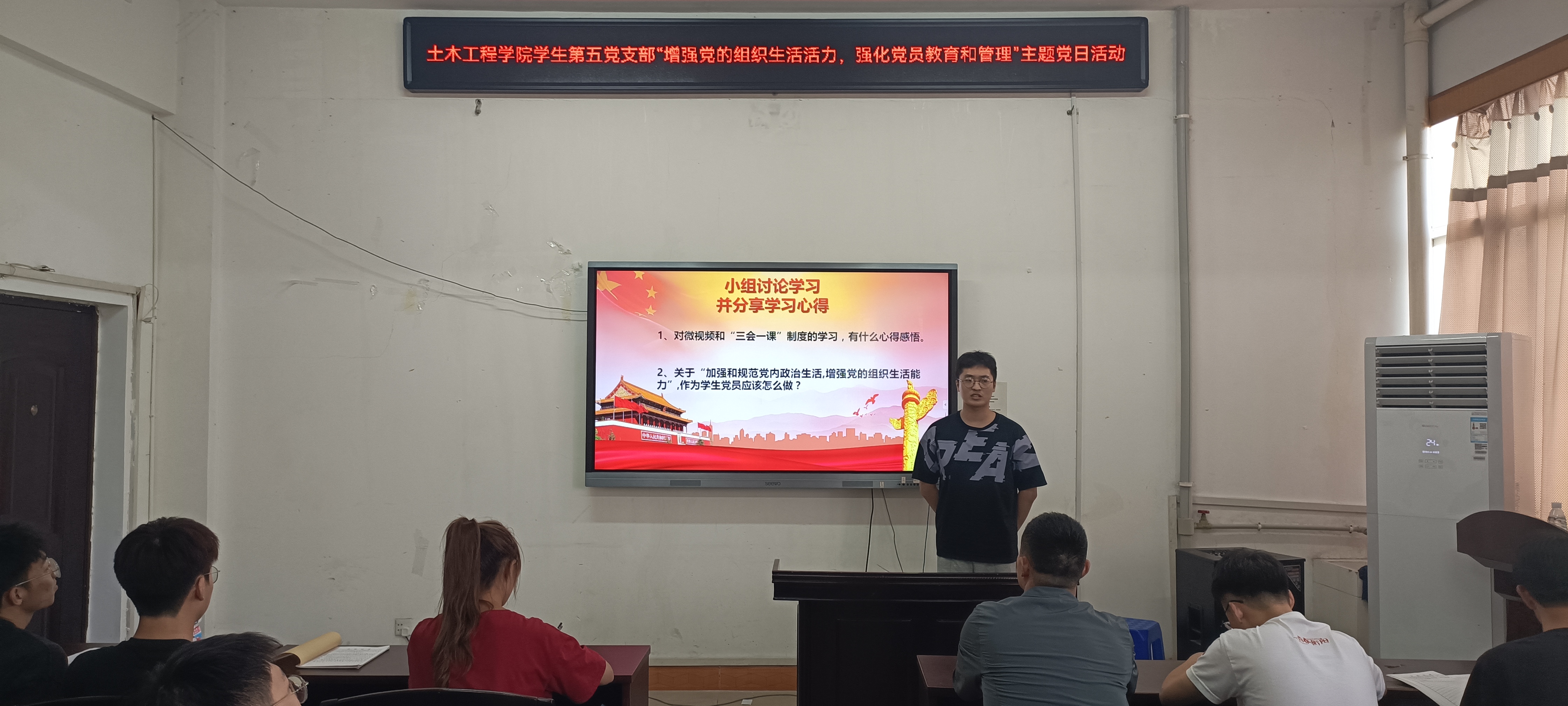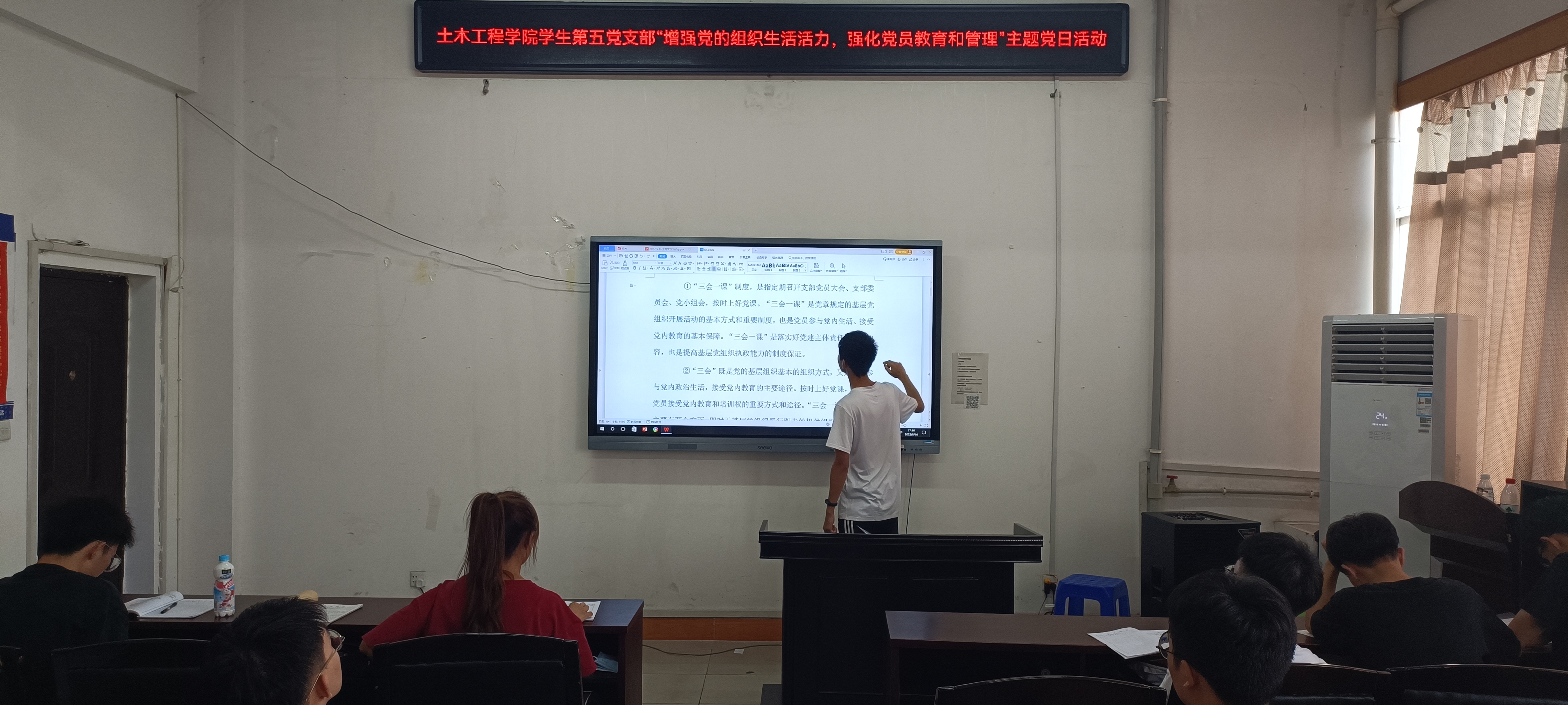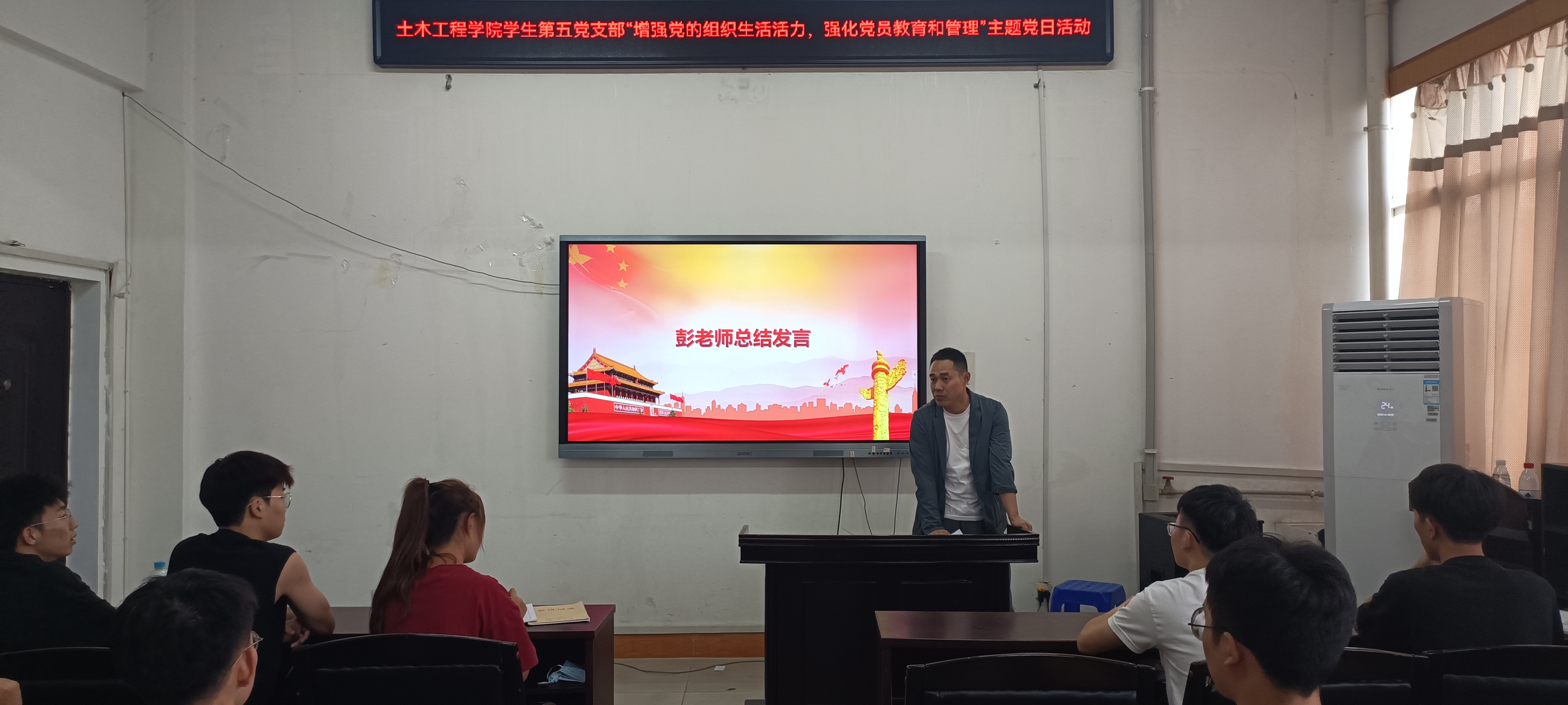 2022年9月16日17:00,土木工程学院学生第五党支部于土木楼四楼会议室举行“加强和规范党内政治生活,增强党的组织生活活力,强化党员教育和管理”主题党日活动,会议由支部书记彭兴明老师主持,全体学生党员参加。