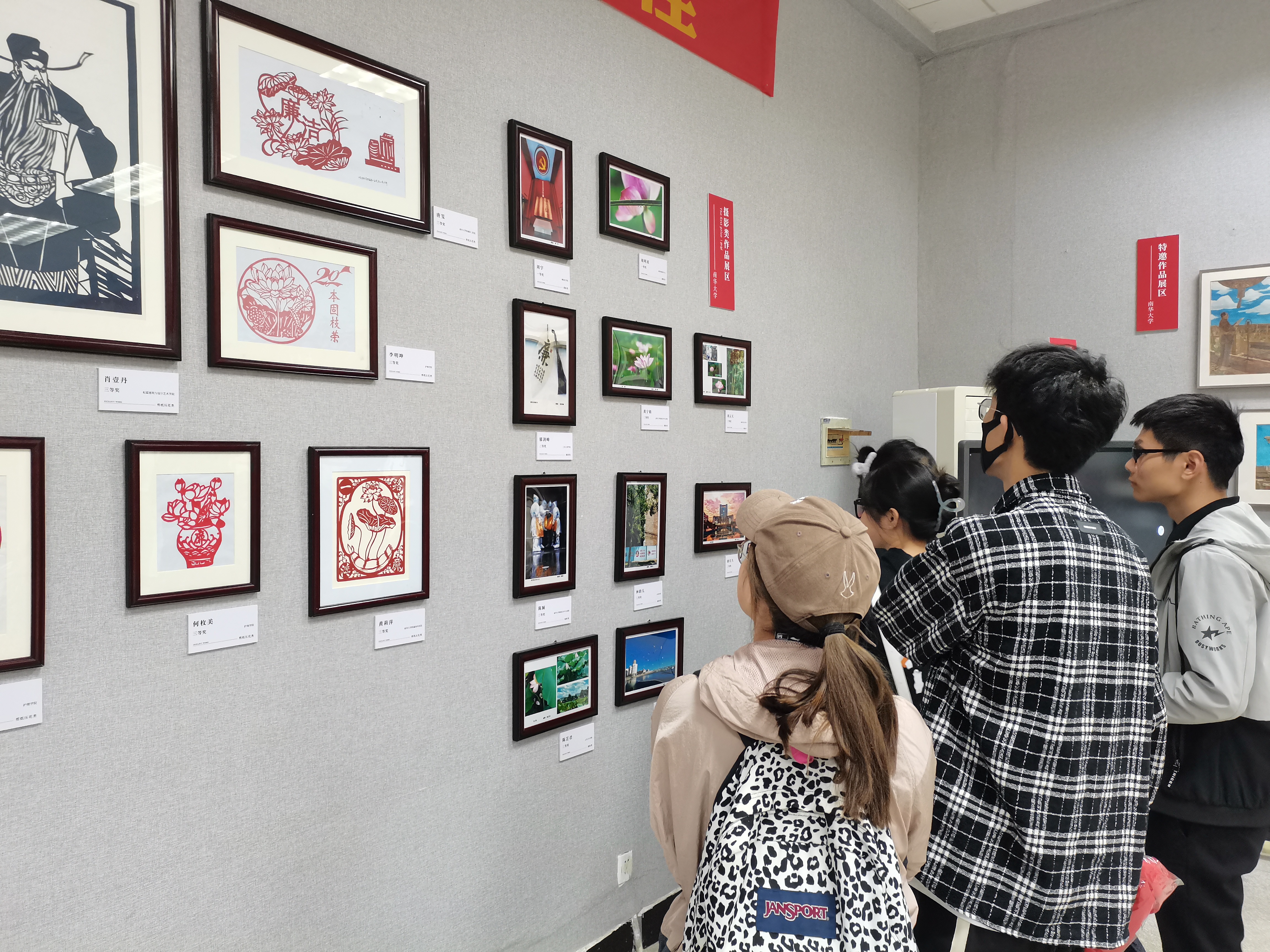 首先,全体党员在展厅前合影留念。廉洁文化作品征集评比活动历时三个多月,各类优秀书画作品云集于此。全体党员在风清气正的办学治校氛围下,感受着艺术魅力,喜迎二十大胜利召开。