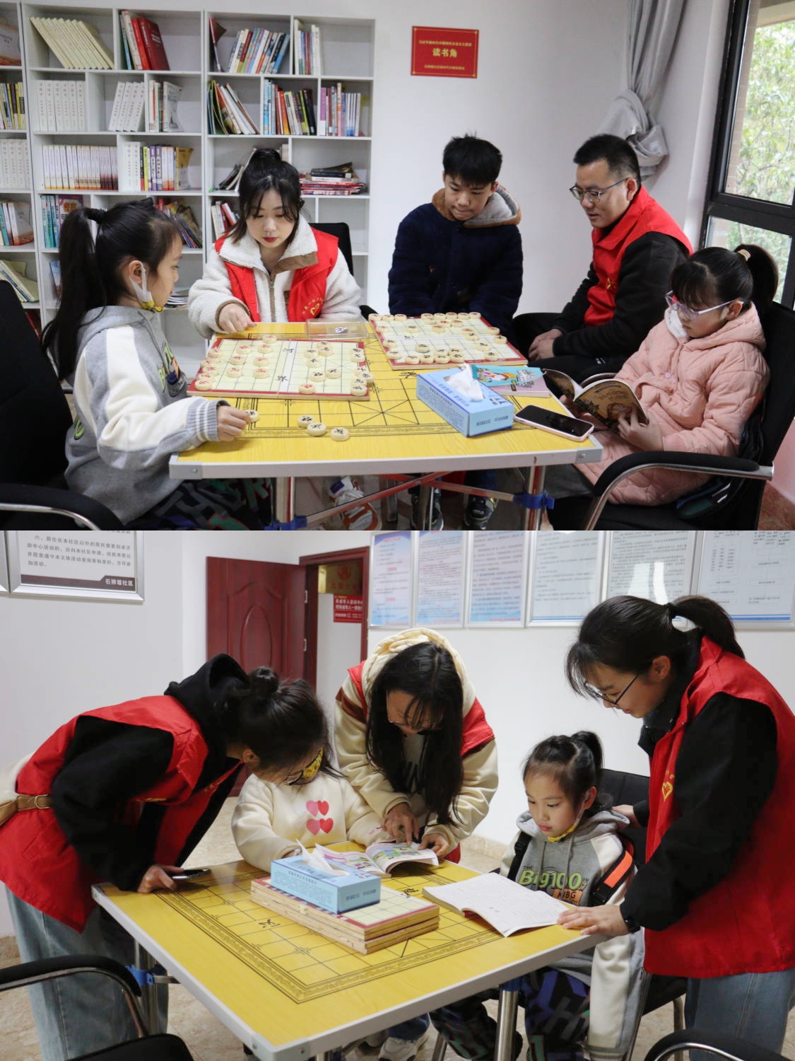 图为志愿者们带领小朋友弈棋、学习