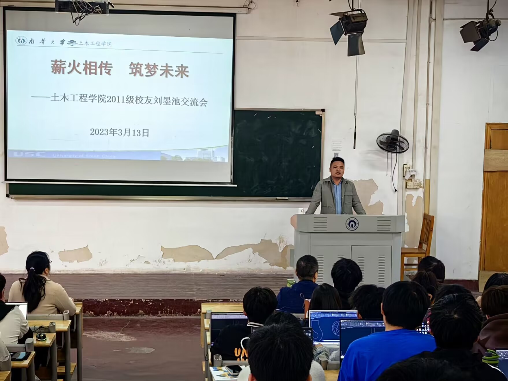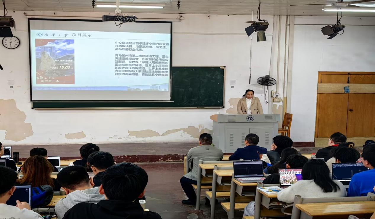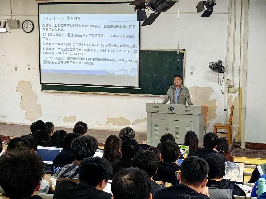 2023年3月13日下午14时30分,时任中交隧道工程局有限公司青岛胶州湾第二海底隧道项目党支部书记兼工会主席、副经理的beat3652011级优秀校友刘墨池应邀参加“薪火相传筑梦未来”的交流会。土木工程学院路桥系副教授李明老师、辅导员刘华老师、路桥专业20级近百名同学参加会议。