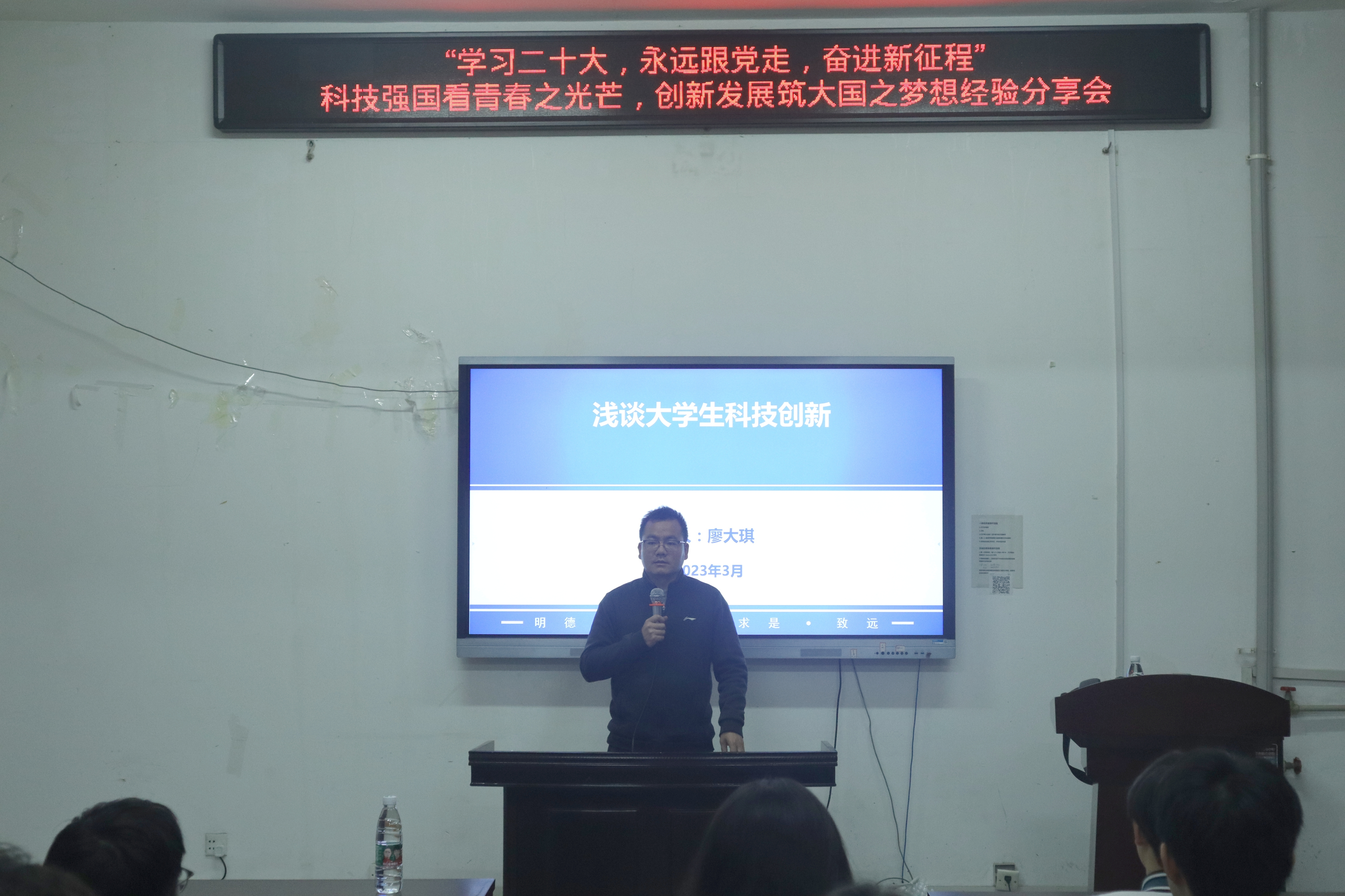 会议伊始,吴旦老师介绍了举办本次分享会的目的。接着,廖大琪老师为大家作创新创业竞赛经验分享。他询问同学们对创新创业相关知识的基本认识,并通过列举往届南华学子优秀事例为同学们解答了科创的意义及其益处;引用一支科创团队的真实事例,让同学们认识到团队合作、静心科创的重要性;谈及科创带来的改变这一问题,他指出,把科创想法应用到实际才能带来社会效益和经济效益,落实到个人现实情况,这需要同学们提升个人的基本素养,锻炼科创思维,在生活细节处发现科创,从各类科创竞赛中找到适合的目标并为之付出努力。随后,他祝愿同学们都能在科创竞赛中取得满意的成绩。