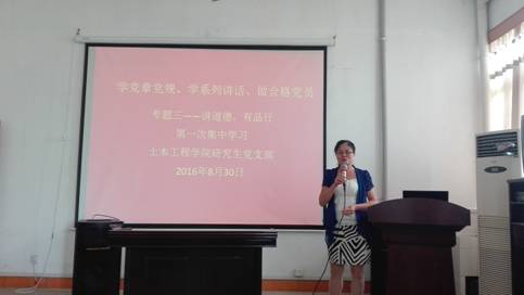 2016年8月30日下午,土木工程学院研究生党支部组织全体党员开展“两学一做” “讲道德,有品行”专题三集中学习,此次集中学习由党支部书记杨金辉老师主持,在土木工程学院四楼会议室举行。由于新学年开始,我们党支部也迎来了新一届的研究生成员,为党支部注入了新鲜血液。会议聚集了研二研三的在校研究生党员以及研究生新生党员,会议开始阶段,党支部表达了对新生党员的热烈欢迎,并邀请研究生新生党员逐个进行了自我介绍,大家相互之间有了初步认识。之后党支部会议进行到“两学一做”的“讲道德,有品行”的专题集中学习阶段,学习习近平总书记关于社会主义核心价值观的重要论述,在座党员认真听取并学习了专题的详细内容。