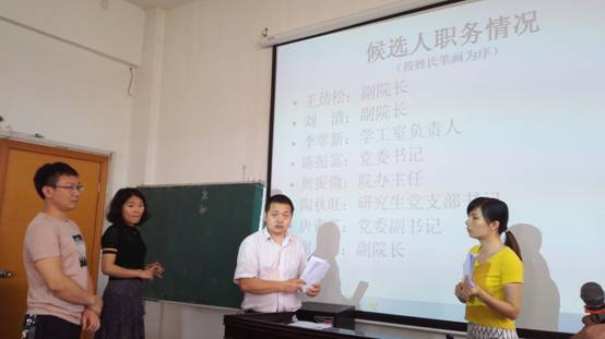 2018年6月6日,在四楼会议室学院教职工党员和部分本科生、研究生学生党员召开学院党委换届选举党员大会,会议由陈振富书记主持。本次选举有选举权的到会人数超过应到会人数4/5,符合选举要求。