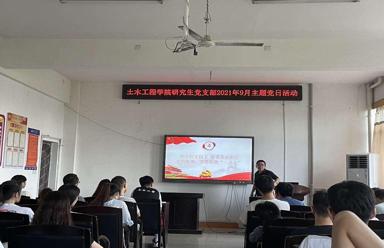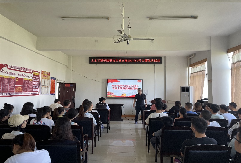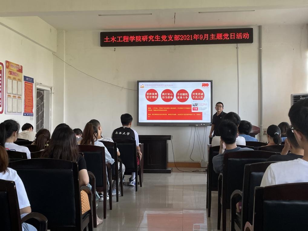 2021年9月26日下午,为庆祝中国共产党成立100周年,深入学习习近平新时代中国特色社会主义思想,增强全体党员责任意识和爱国情怀,土木工程学院研究生党支部全体党员于土木工程学院421开展以“学习贯彻中国共产党成立100周年大会重要讲话精神”为主题的党日活动,活动由支部书记陶秋旺老师主持,全体党员参加。