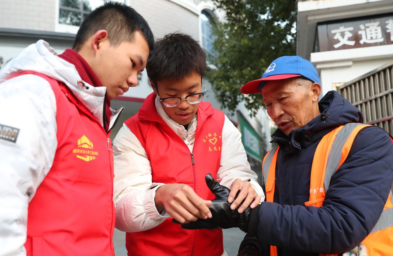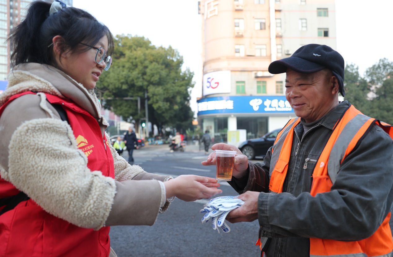 志愿者们提前准备好姜茶、口罩、围巾、棉手套、暖宝宝等物品,在吴旦的带领下从beat365亚洲版官网红湘校区北门集合出发,到达目的地后,志愿者们为环卫工人们戴上棉手套,披上围巾,给他们递上一杯杯热乎的姜茶,并帮助环卫工人完成手头的卫生清洁工作。志愿者们与环卫工人亲切交谈,询问他们的生活状况、身体状况,并不断嘱咐他们在寒冬中要保重身体,注意安全。环卫工人在寒冷的冬天里,用自己的辛勤劳动守护城市的绿色风景线,他们的付出值得我们尊重和感激。