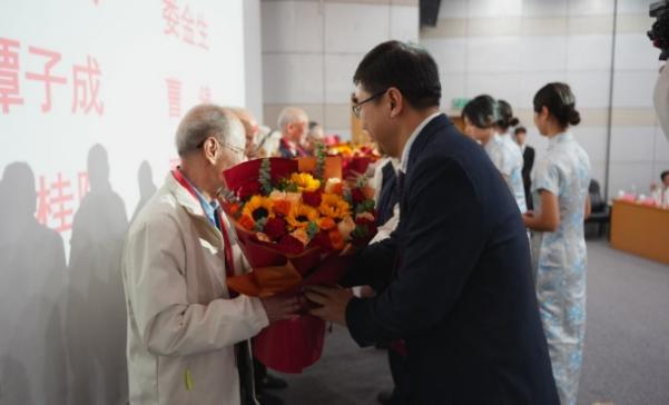 接着,土木工程学院领导和校友代表在开幕式上向老教师献花,以表彰他们对学院发展做出的卓越贡献,并表达深深的敬意和感谢。