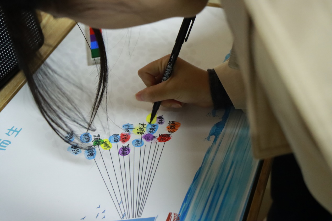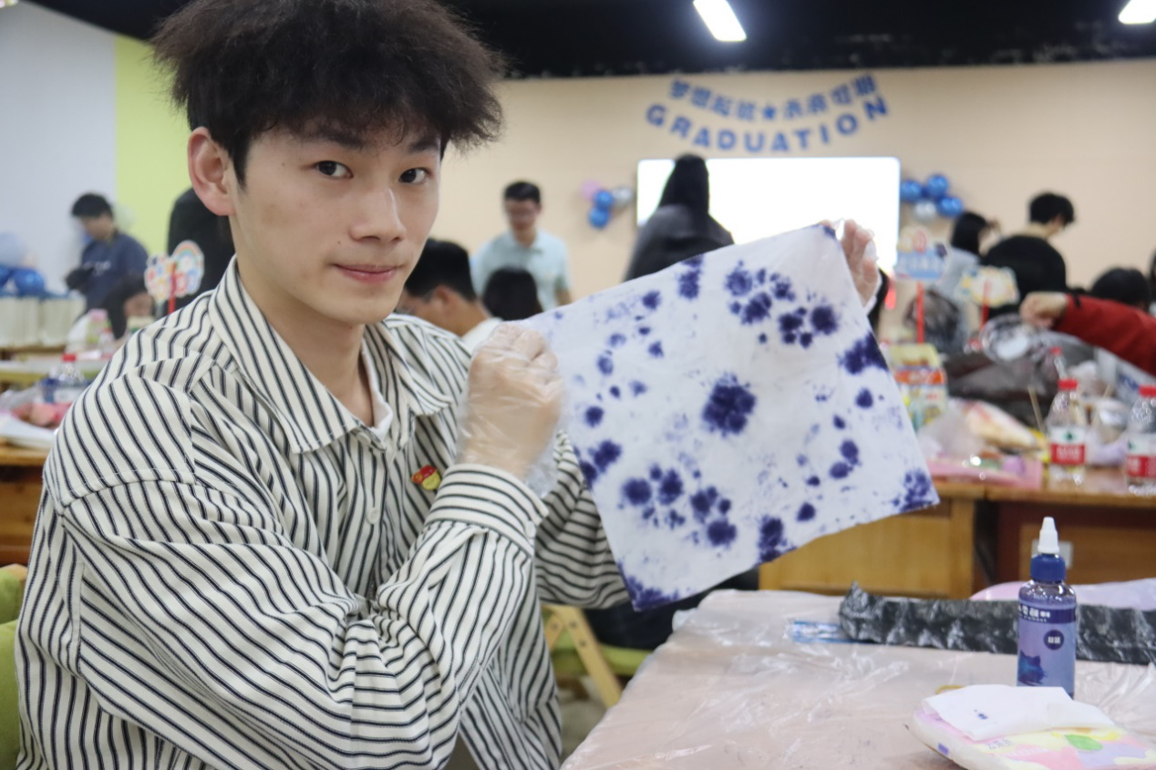 随后,主持人介绍扎染工艺的历史以及制作程序,让毕业生党员体验扎染过程,用方巾去描绘属于自己独特青春的颜色,毕业生党员在画布上渲染出绚丽的画卷,表达自己对未来美好的期望。