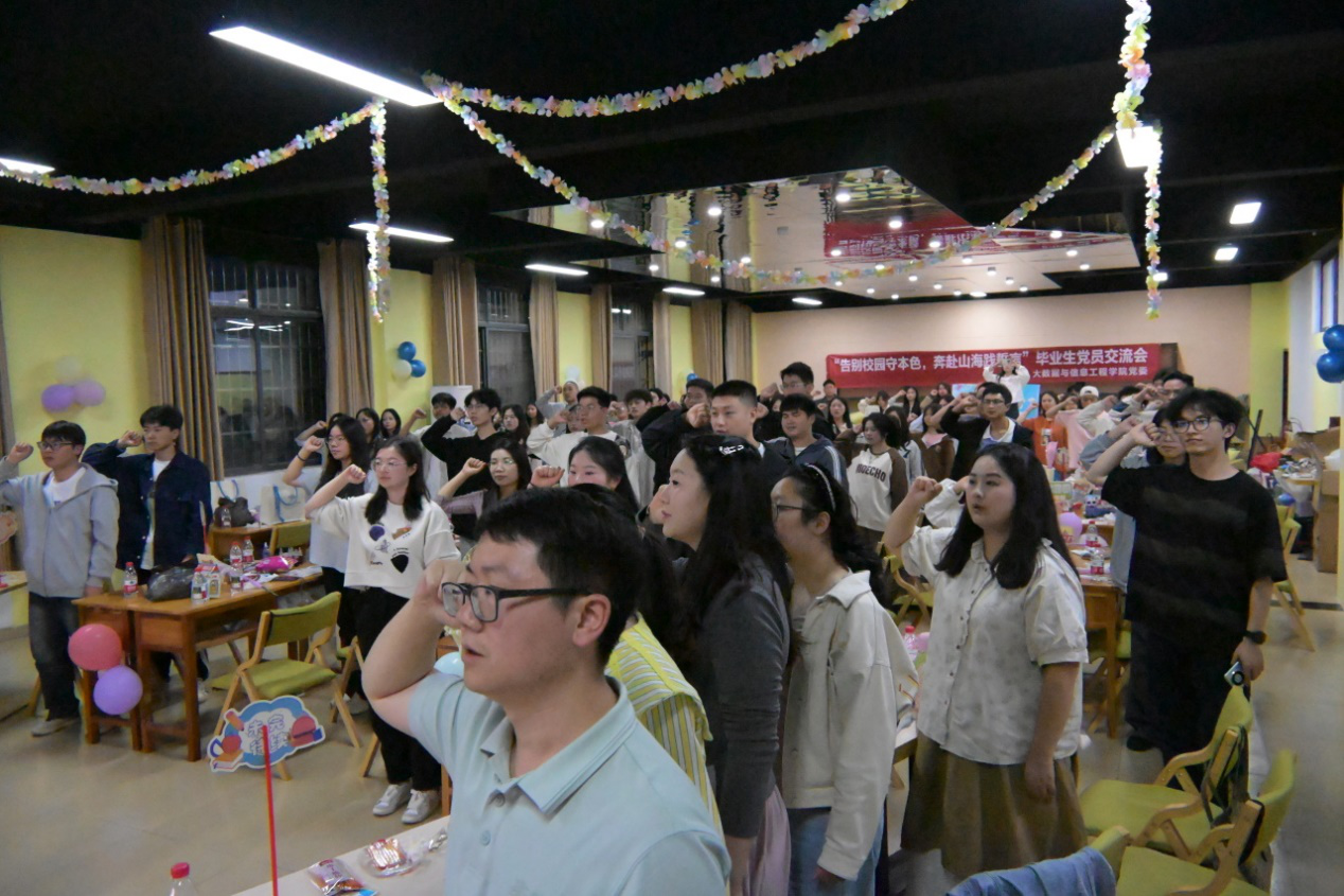 活动最后,全体毕业生党员面向党旗,重温入党誓词。大数据与信息工程学院书记朱克超寄语毕业生:“从今天起,无论你们走向何方,党员身份是永不褪色的政治名片。希望你们始终以党章为镜,常修己身、常思己过,在纷繁世界中守住“忠诚干净担当”的政治品格,做信仰坚定的“明白人”。