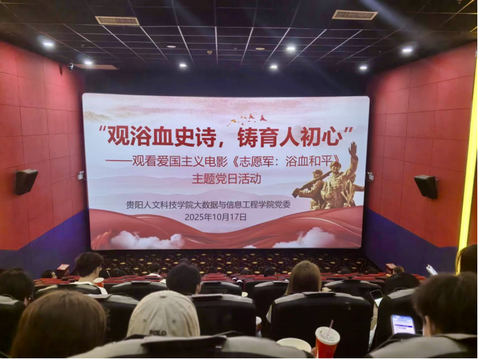 为赓续红色血脉、筑牢育人初心,10月17日,大数据与信息工程学院党委组织学院师生集体观看爱国主义教育影片《志愿军:浴血和平》,并举办线上+线下相结合的思想感悟交流会。通过光影艺术重温抗美援朝峥嵘岁月,深刻感悟使命担当,进一步增强师生的历史使命感与民族自豪感。