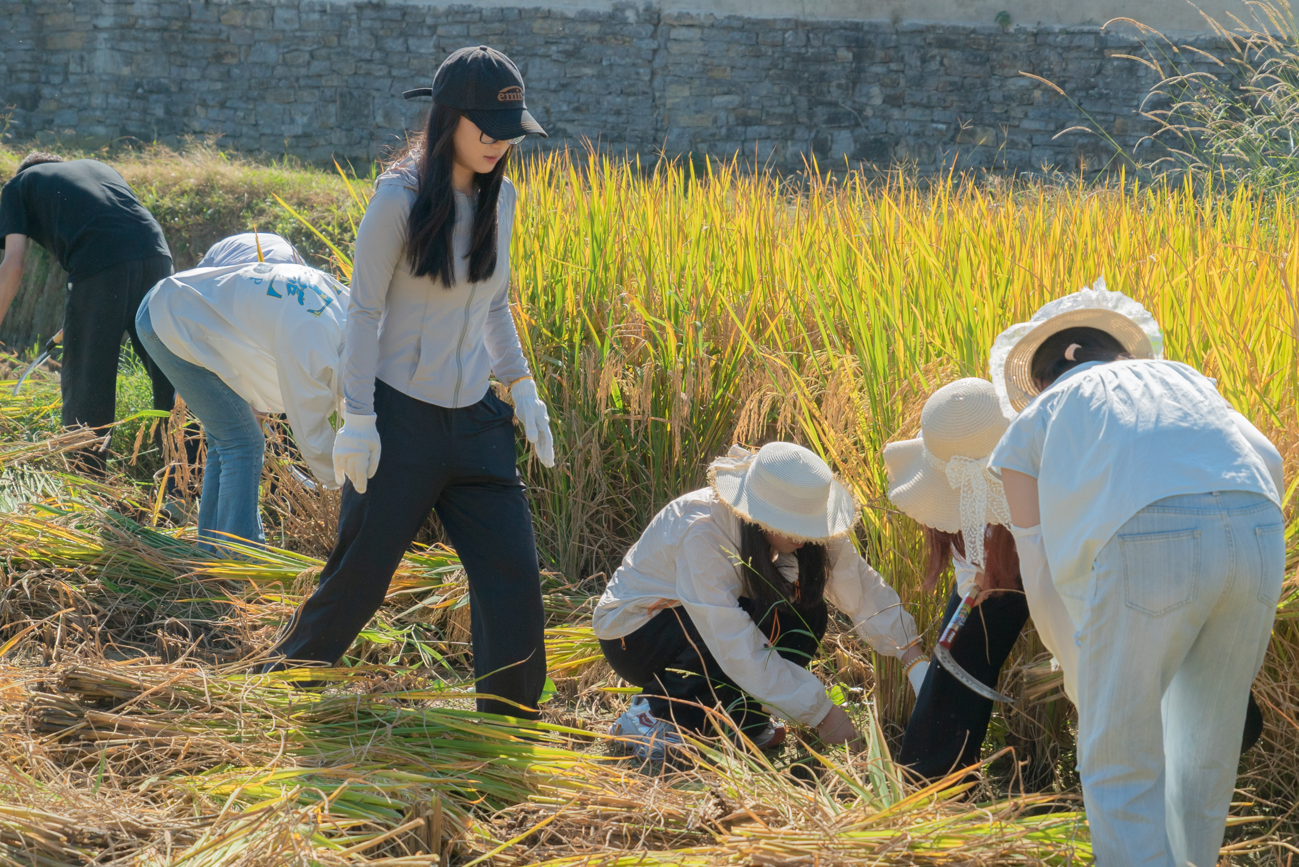 抵达路寨村后,连片稻田里金黄的谷穗随风摇曳,村民们忙碌的身影点燃了学员们的热情。在郭薇书记及村民的指导下,学员们迅速掌握了割谷、打谷、装袋的技巧,纷纷拿起镰刀、扛起粮袋,穿梭于田间地头。张福高书记与两位老师带头参与劳作,一边收割谷子,一边与郭薇书记深入交流,了解村情民意,探讨粮食产销和乡村治理等实际问题特别是三农法律相关实务问题。师生党员分工协作,汗水浸透了衣衫,但干劲不减,大家以实际行动践行着“为人民服务”的初心使命。