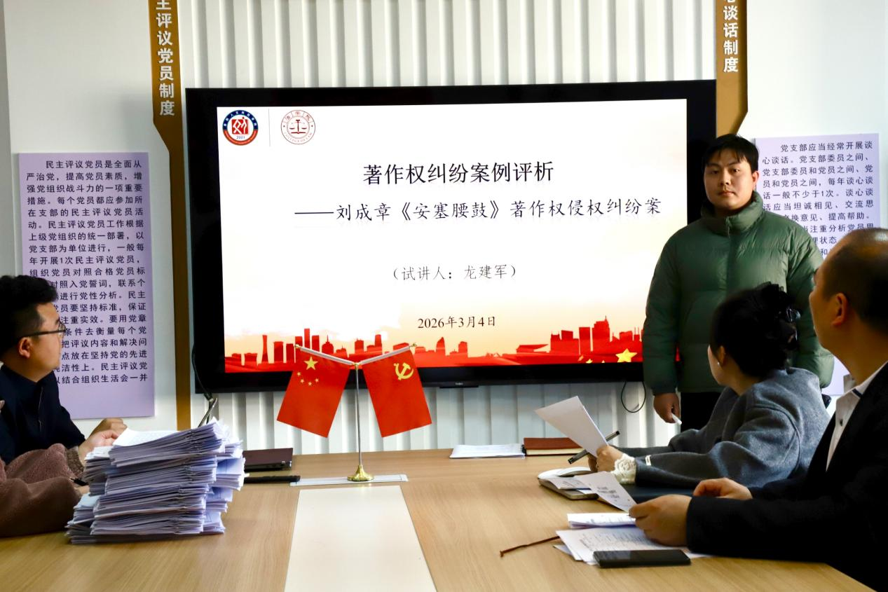 考核现场,四位新进教师依次进行试讲。龙建军老师首先以“刘成章《安塞腰鼓》著作权侵权纠纷案”进行案例评析,通过案例讲解权利适当性司法认定、合理使用与法定许可等核心知识点,以案例贯穿全课堂并设计课堂互动,教学思路清晰。