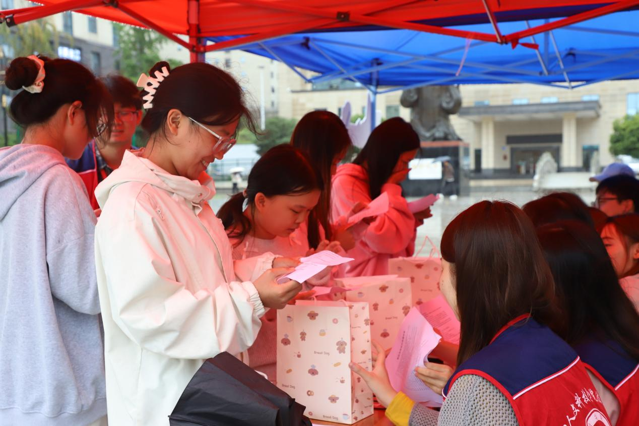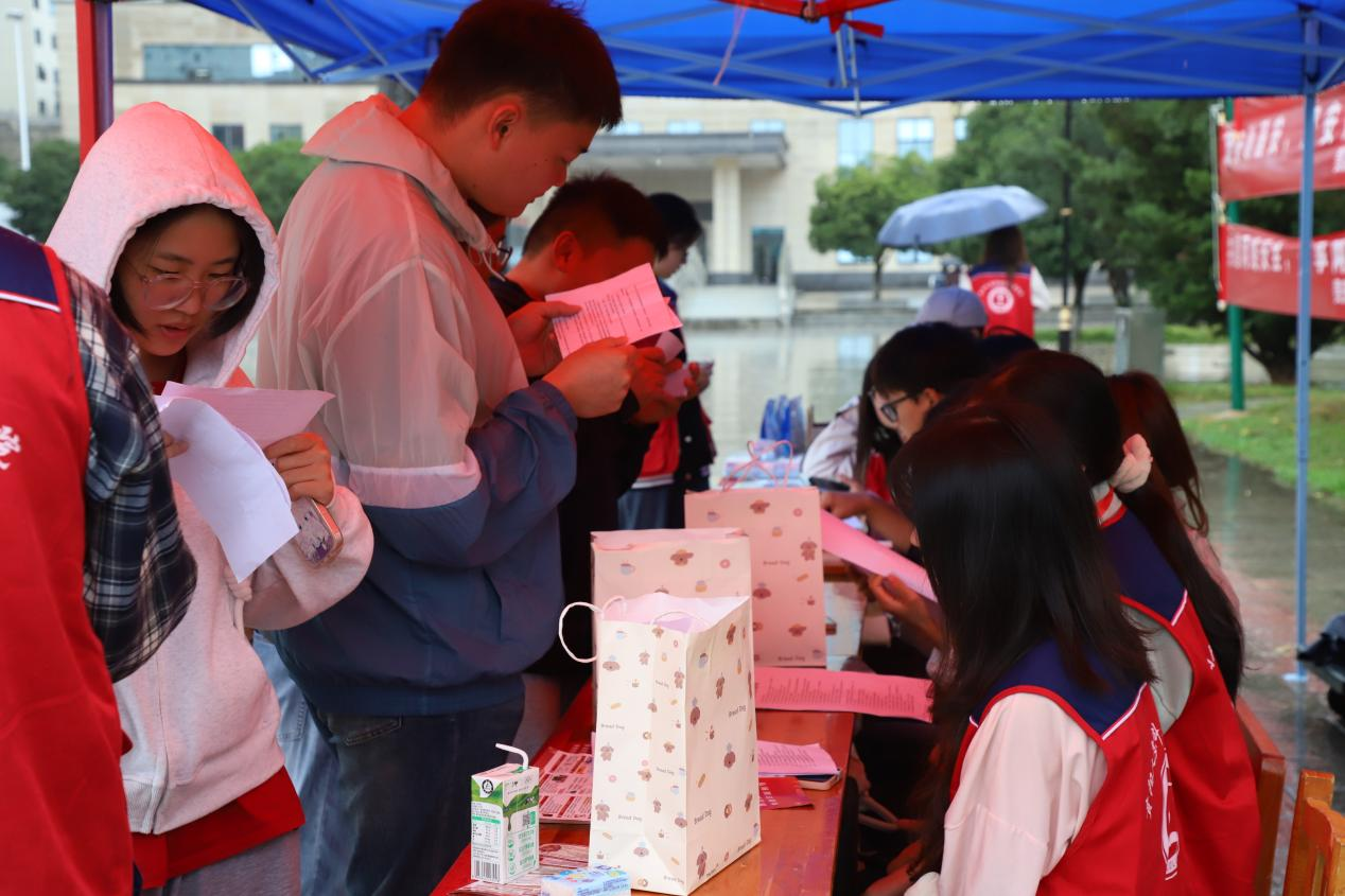 9月25日上午9时,雨势不断,法学院的同学们却丝毫未受影响,在孔圣广场上撑起雨伞、搭起雨棚,从“宪法知识趣味问答”到普法手册发放,同学们冒雨坚守岗位,耐心解答每一个问题,热情引导来往同学参与互动。雨幕中,他们手持宣传材料穿梭在校园的身影格外醒目,他们用坚持传递着对法治宣传的热忱,也让“尊法、学法、守法、用法”在淅沥雨声中依然能够清晰传递。