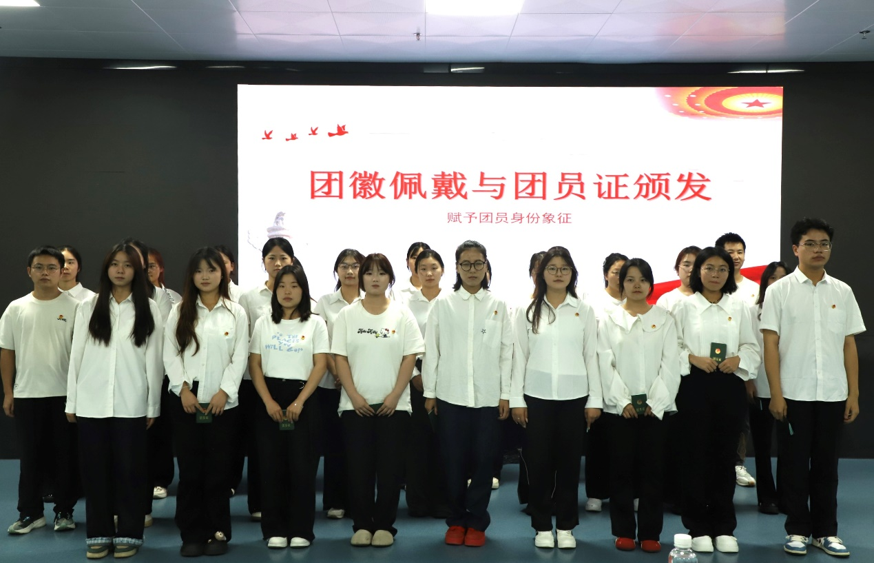 仪式准时开始,伴随着激昂的国歌声,全体人员肃立,目光坚定,在歌声中传递出对祖国的热爱与忠诚。歌声落下,各班团支书为新团员郑重佩戴团徽、颁发团员证。一枚枚闪耀的团徽,一本本团员证,既是荣誉的见证,更是责任的寄托。