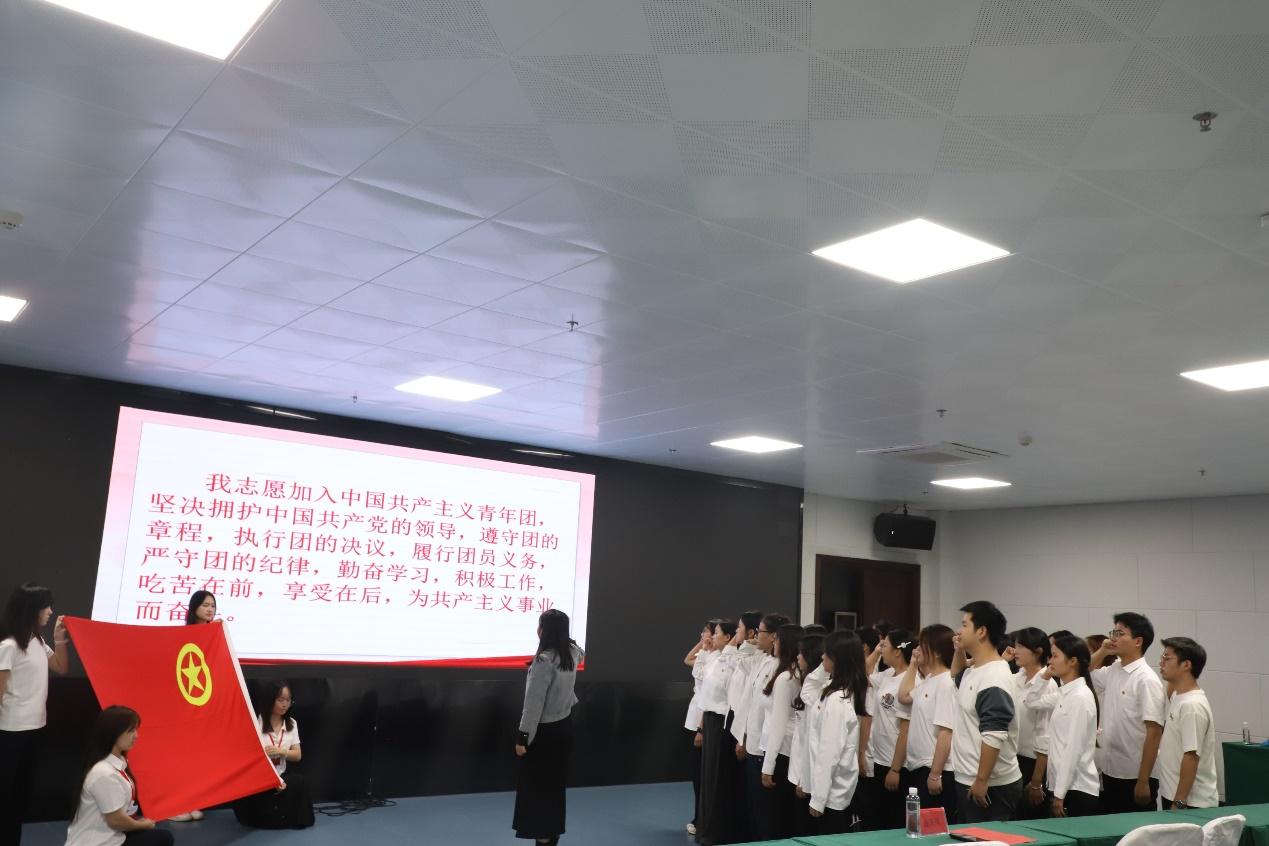 紧接着,在金庆凤老师的带领下,全体新团员面向团旗立正,以洪亮而坚定的声音庄严宣誓:“我志愿加入中国共产主义青年团,坚决拥护中国共产党的领导,遵守团的章程,执行团的决议,履行团员义务,严守团的纪律,勤奋学习,积极工作,吃苦在前,享受在后,为共产主义事业而奋斗。” 铮铮誓言在会议室回荡,彰显着新团员们为共产主义事业奋斗的决心。