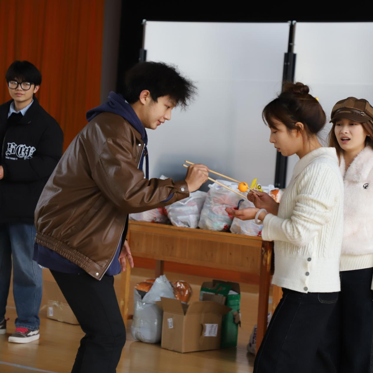 短跑比赛结束后,同学们洋溢着欢笑转战体育馆。紧接着的筷子夹乒乓球比赛,堪称“精细度的较量”。选手们手持筷子,小心翼翼地将乒乓球转运至终点,同学们手腕轻稳,既要控制力度避免球掉落,又要加快节奏提升效率。球在筷间稳稳“接力”,偶有失误也会默契调整节奏,尽显团队合作精神。赛场边的助威声里,既有对失误的惋惜,更有对每一次成功夹取的喝彩——这是指尖的较量,更是严谨与耐心的生动展演。