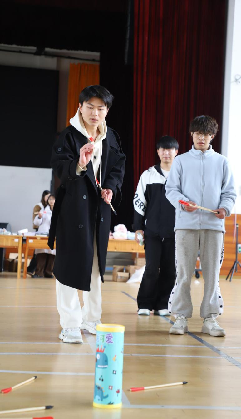 活动现场的投壶项目,成了全场的亮点。场地中央摆着印着卡通图案的投壶容器,选手们手持竹箭,站在指定线外屏气凝神。同学们指尖捏紧箭杆,目光锁定壶口,手腕轻扬间,竹箭向壶身飞去;地上散落的几支竹箭,透着比赛的紧张与热闹——有的箭擦着壶边落地,引来一阵惋惜的轻呼;有的箭稳稳入壶,立刻收获周围同学的喝彩。