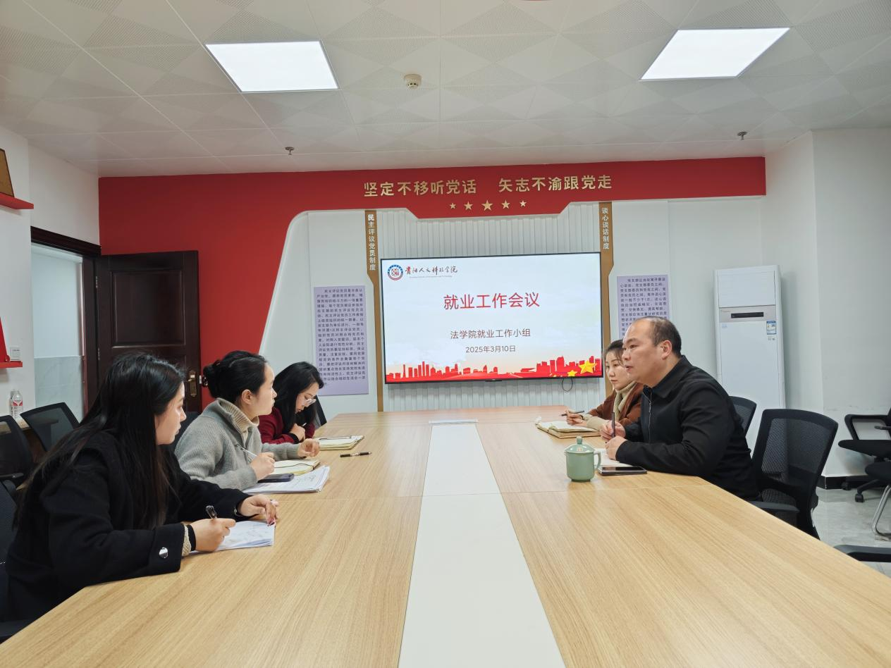 3月10日下午,法学院在师德楼610会议室召开了2025届毕业生就业工作会议。法学院党委书记张福高、副书记杨晶晶,负责学院就业工作王瑶老师,以及2025届班主任邹晨欣、金庆凤参加会议。会议由法学院党委书记张福高主持,本次会议共同探讨如何更有效地助力毕业生顺利走向职场,并就就业工作经验进行了充分交流。