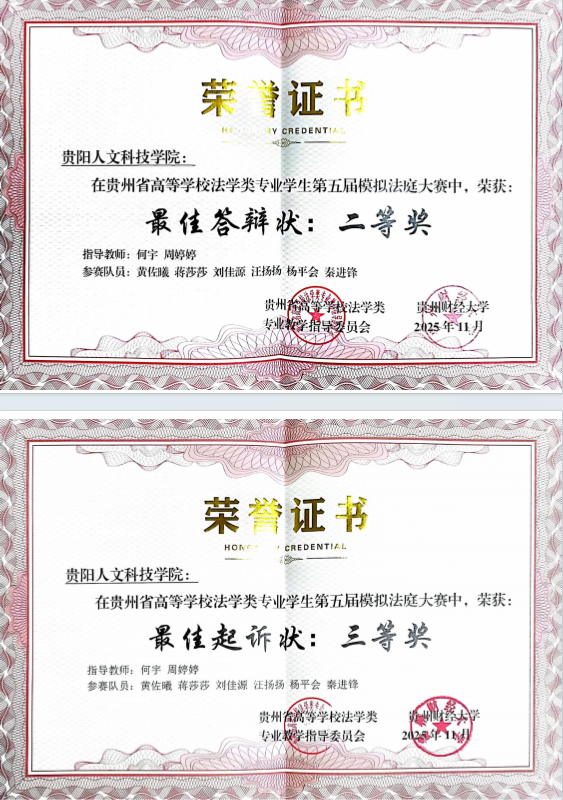 近日,在刚刚落幕的“贵州省高等学校法学类专业学生第五届模拟法庭大赛”中,我院学子凭借扎实的专业功底、出色的庭辩能力与严谨的法律文书写作水平,在激烈角逐中脱颖而出,荣获两项重要奖项,为学院争得了荣誉!