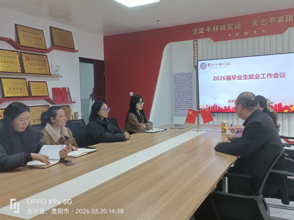 为深入贯彻落实学校关于毕业生就业工作的决策部署,切实推进2026届毕业生高质量充分就业,3月20日,法学院召开2026届毕业生就业工作专题会议。学院党委书记张福高、党委副书记杨晶晶出席会议,2026届全体毕业班班主任及就业工作负责老师参加会议。