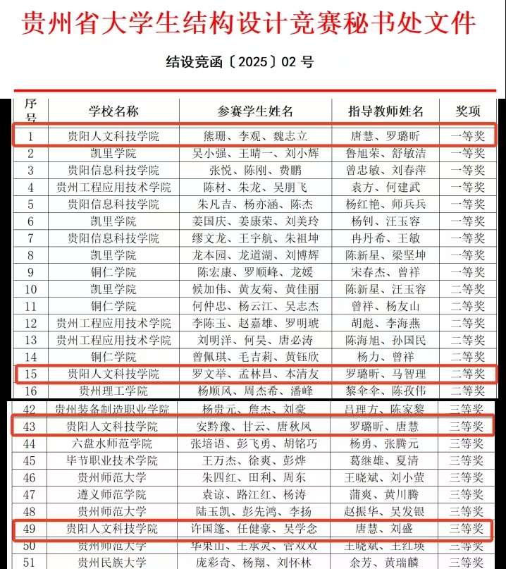 本届竞赛由贵州省教育厅指导,贵州省高等教育学会、全国大学生结构设计竞赛贵州省分区赛秘书处主办,凯里学院承办,吸引了全省15所高校的60支队伍、200余名师生同场竞技。beat365派出四支队伍参赛,最终斩获一等奖1项、二等奖1项、三等奖2项,其中获一等奖的队伍以总分第一名登顶全省榜首——刷新beat365在该赛事的历史记录!