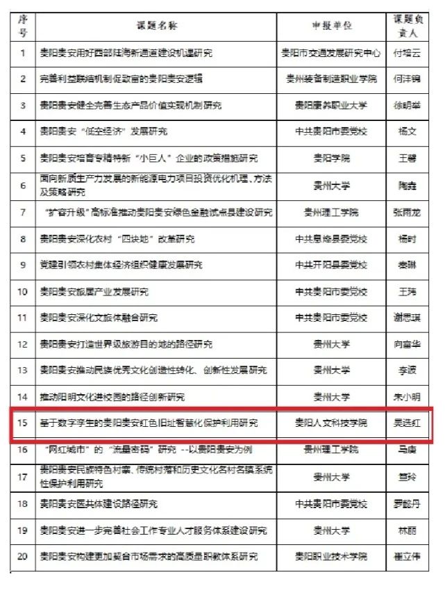 贵阳市社会科学界联合会公布了《贵阳市社科联2025年度社科研究课题》立项名单我院吴选红老师申报的课题《基于数字孪生的贵阳贵安红色旧址智慧化保护利用研究》喜获立项。