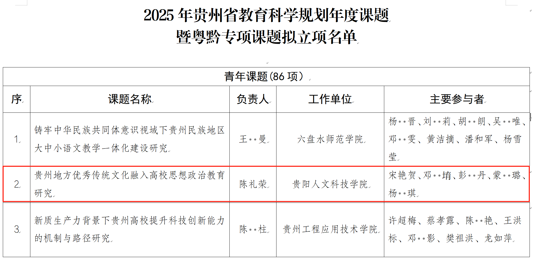近日,贵州省教育厅公布了2025年度贵州省教育科学规划年度课题暨粤黔专项课题拟立项名单中,我院陈礼荣老师申报的《贵州地方优秀传统文化融入高校思想政治教育研究》课题拟立项。