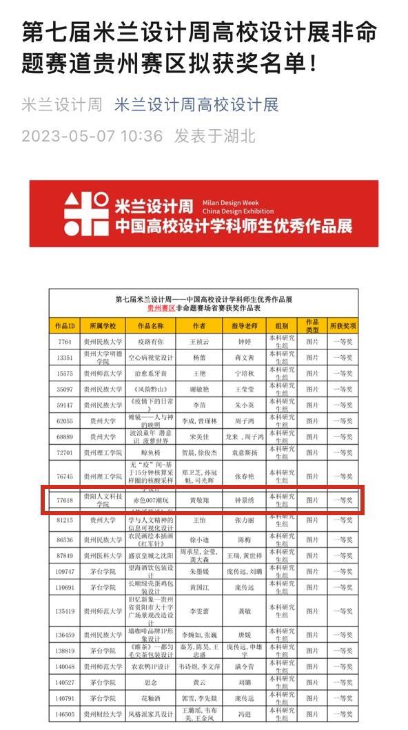 5月7日,第七届米兰设计周高校设计展非命题赛道贵州赛区获奖名单揭晓,经过前期积极筹备,体艺师生在本次比赛中斩获多个奖项,其中一等奖2项、二等奖3项,三等奖7项。