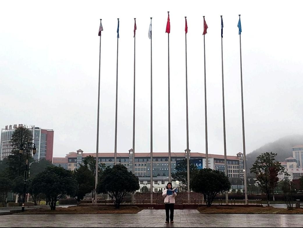 升旗仪式现场,2022级休闲体育专业学生孔海艳丽、2024级环境设计专业学生陈亚楠分别做国旗下的讲话。