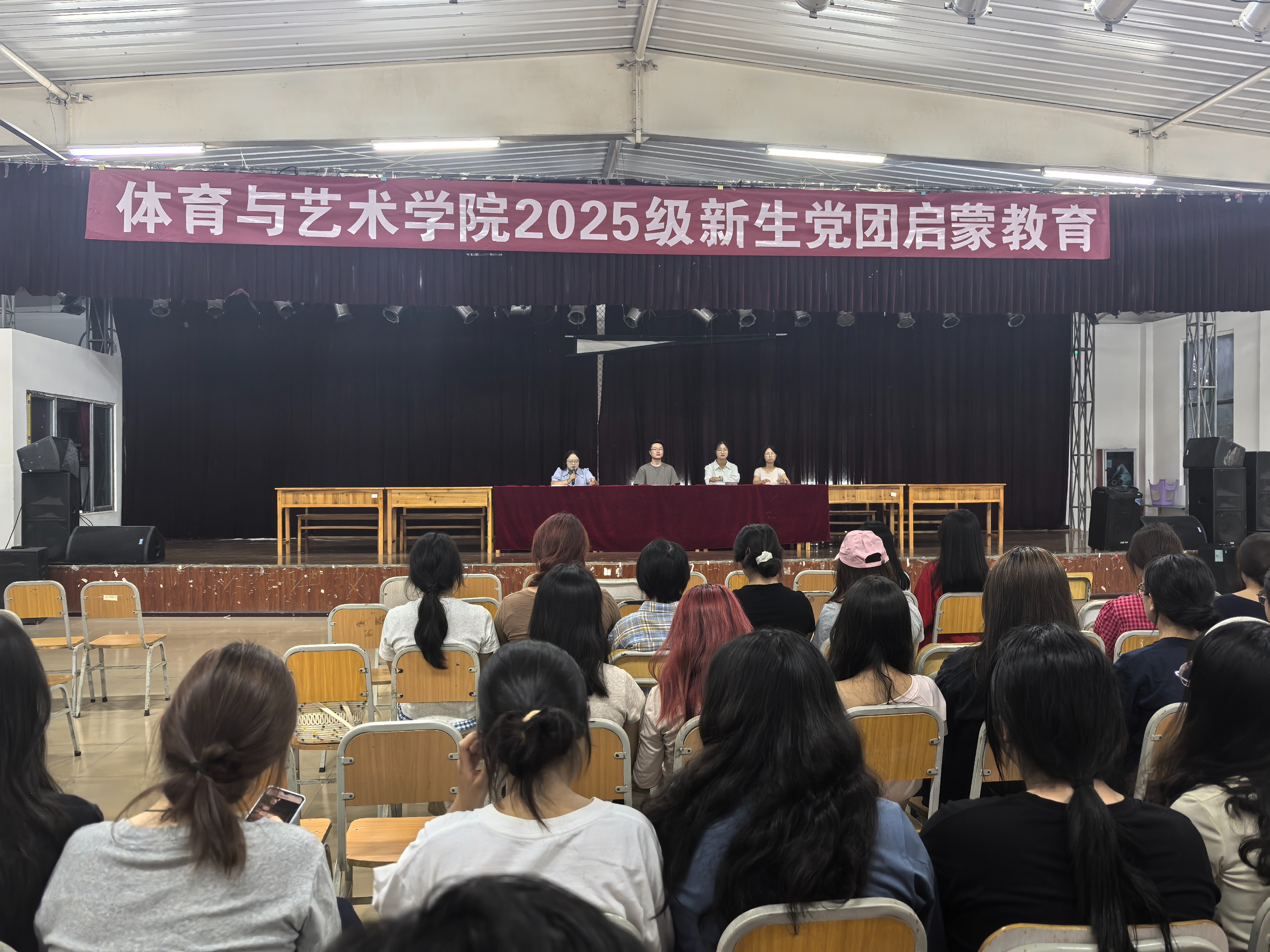 2025年9月9日19时,体育与艺术学院于花溪校区二栋二楼会议室顺利开展2025级新生入党入团启蒙教育活动。本次活动旨在引导新生明确政治成长方向,规范入团入党流程,深化对团组织与党组织工作的认知。学院组织员支胜杰、团委书记张鸿雁、学生第一党支部负责人杨宋妹、学生第二党支部书记吴宗敏出席并作专题讲解,450余名新生共同参与。